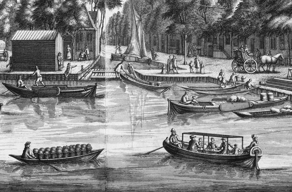 zeilschuiten naar Leiden. Alles van en naar Leiden ging dus bij de Overtoom van of aan boord. Het eerste stuk met de zeilschuit ging vaak aan de