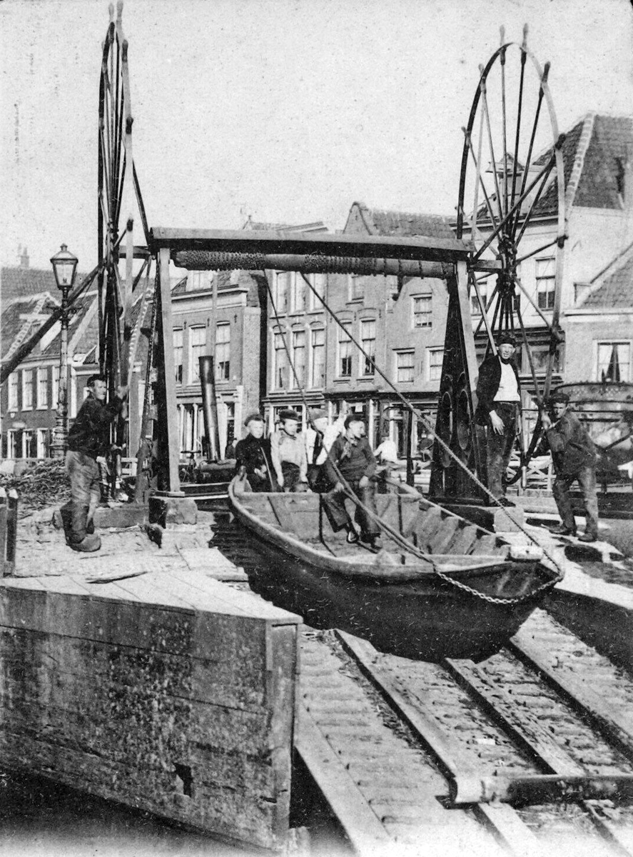 De uit 1916 stammende dubbele liftoverhaal tussen de Kostverlorenvaart en de Postjeswetering. In de topjaren passeerden er, op weg naar de Markten, circa 90 schuiten per dag. De schuiten liggen op polderniveau en de mannen staan voor de 'bak' met het water van de Kostverlorenvaart.