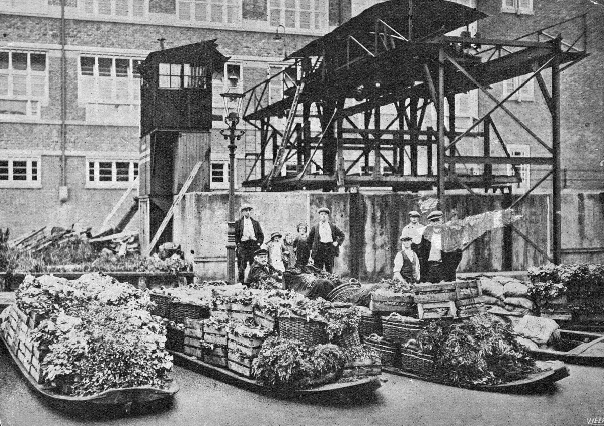 De tuindersschuiten zijn op hun weg terug. De linker schuit lijkt een lading mest (uit de manège van de bereden politie?) mee te nemen. Het lijkt een houten schuit met binnenboordmotor te zijn. De rechter schuit is van staal en is motorvaartuig. Jammer genoeg zijn er weinig foto's van deze overhaal te vinden en rechtenvrije foto's zijn helemaal schaars. In 1955 werd de liftoverhaal verder buiten de stad geplaatst. Vier jaren daarna verdween hij toch helemaal.