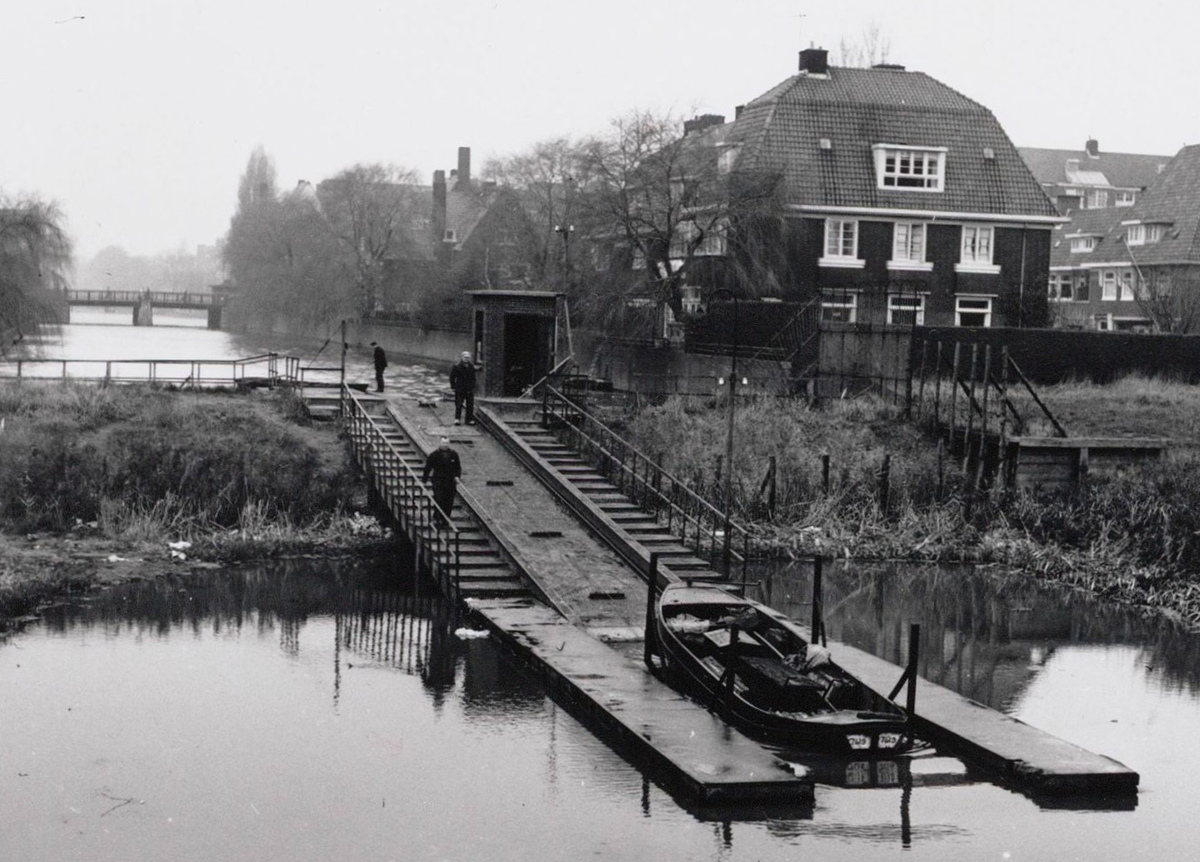Zicht over de overhaal richting Admiraal De Ruyterweg. Het vaarwater boog sterk naar rechts en na de passage van de Admiraal De Ruyterweg kreeg men dan de Slatuintjes een lange aaneenschakeling van groetenkwekerijen, afgewisseld met weilanden.