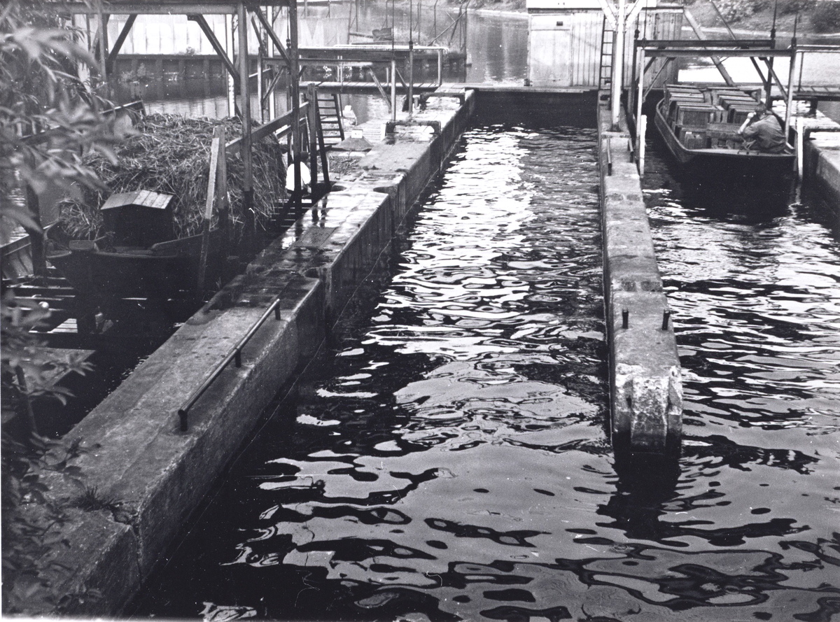 Hier zijn de twee portalen met hun hijskooien goed te zien. Het linker vaartuig lijkt mij een houten veldschuit, het rechter is een klein open motorvrachtscheepje, vermoedelijk een plaatselijk model van de de scheepswerf Gouwerok, die naar men zegt vroeger aan de Boerenwetering zat. Het motorschuitje zal vermoedelijk de veldschuit op sleeptouw zal nemen.