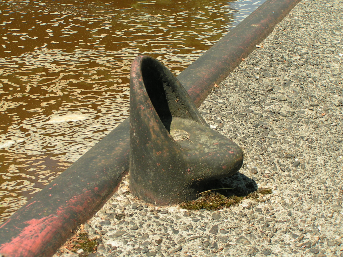 Een bolder met een paddestoelmodel. Bij dit model is het, als men de lus met een extra slag rond de bolder legt, zoals bij de gelige tros, wat lastiger voor voorbijgangers om 'voor de aardigheid' de lus van de bolder te wippen.