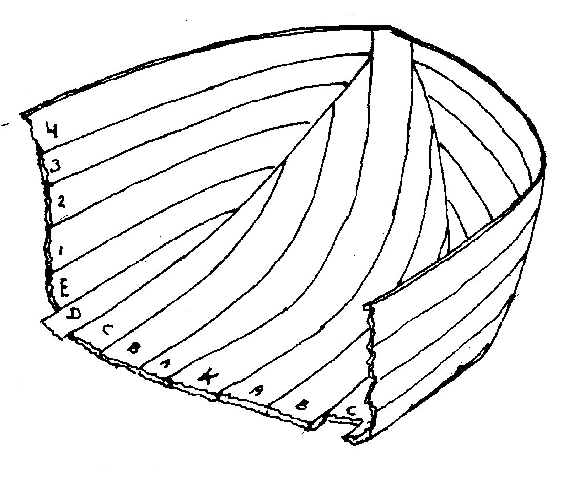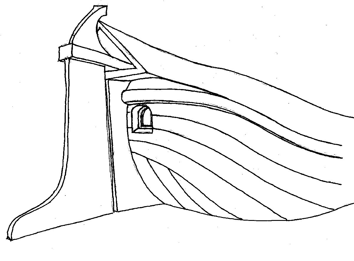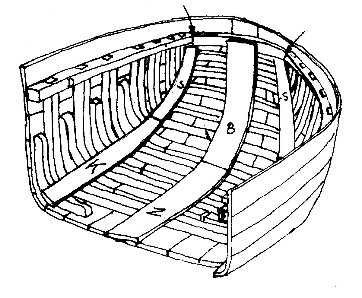 In het voorschip, tussen het bovenste kussen en de dekwegers, (zie pijlen) zijn vaak een paar zware houten knieën aangebracht. Soms wordt er echter één doorlopend stuk het