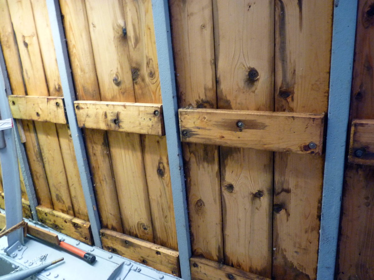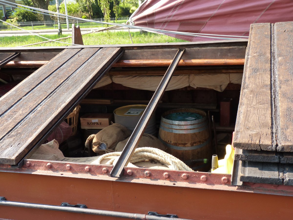 Normaal zijn de klampen aan het luik geklonken, bij deze luikenkap zijn ze gespijkerd. Dat de middelste klamp een stalen strip is, komt vaker voor. De onderste klamp is meestal van eikenhout en wordt pas als de luiken op het schip gepast zijn, vastgezet.