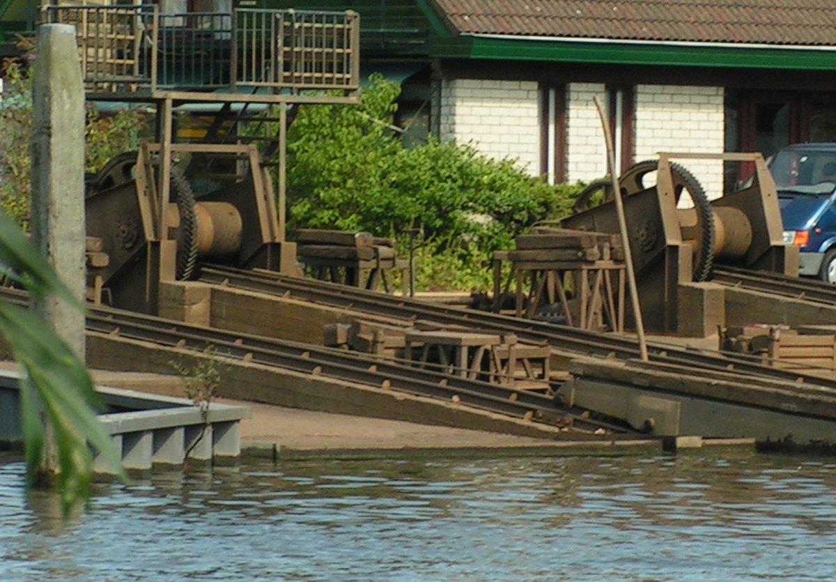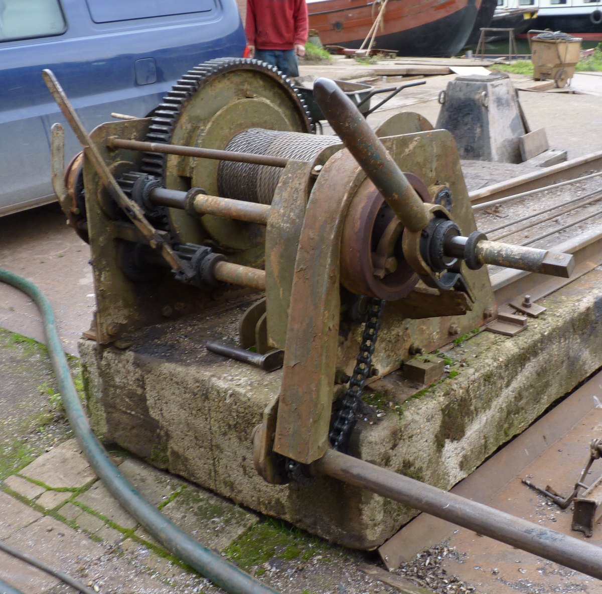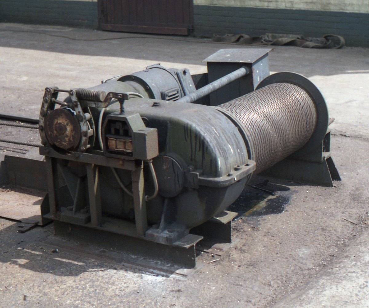 mechanisch aangedreven lier gebouwd is. Rechtsonder de centrale as waarmee alle lieren tegelijk aangedreven kunnen worden. Individuele bediening van de lieren is mogelijk.