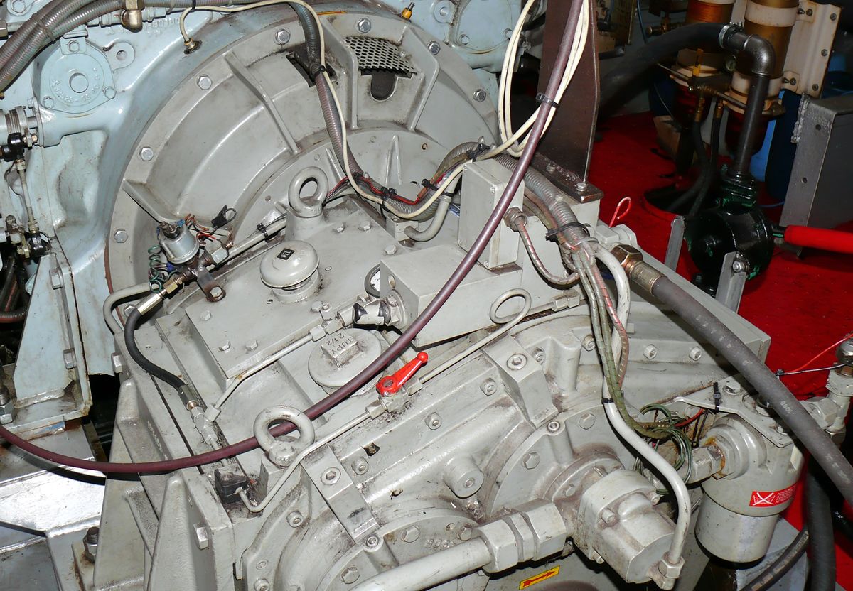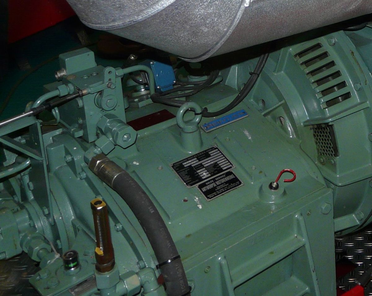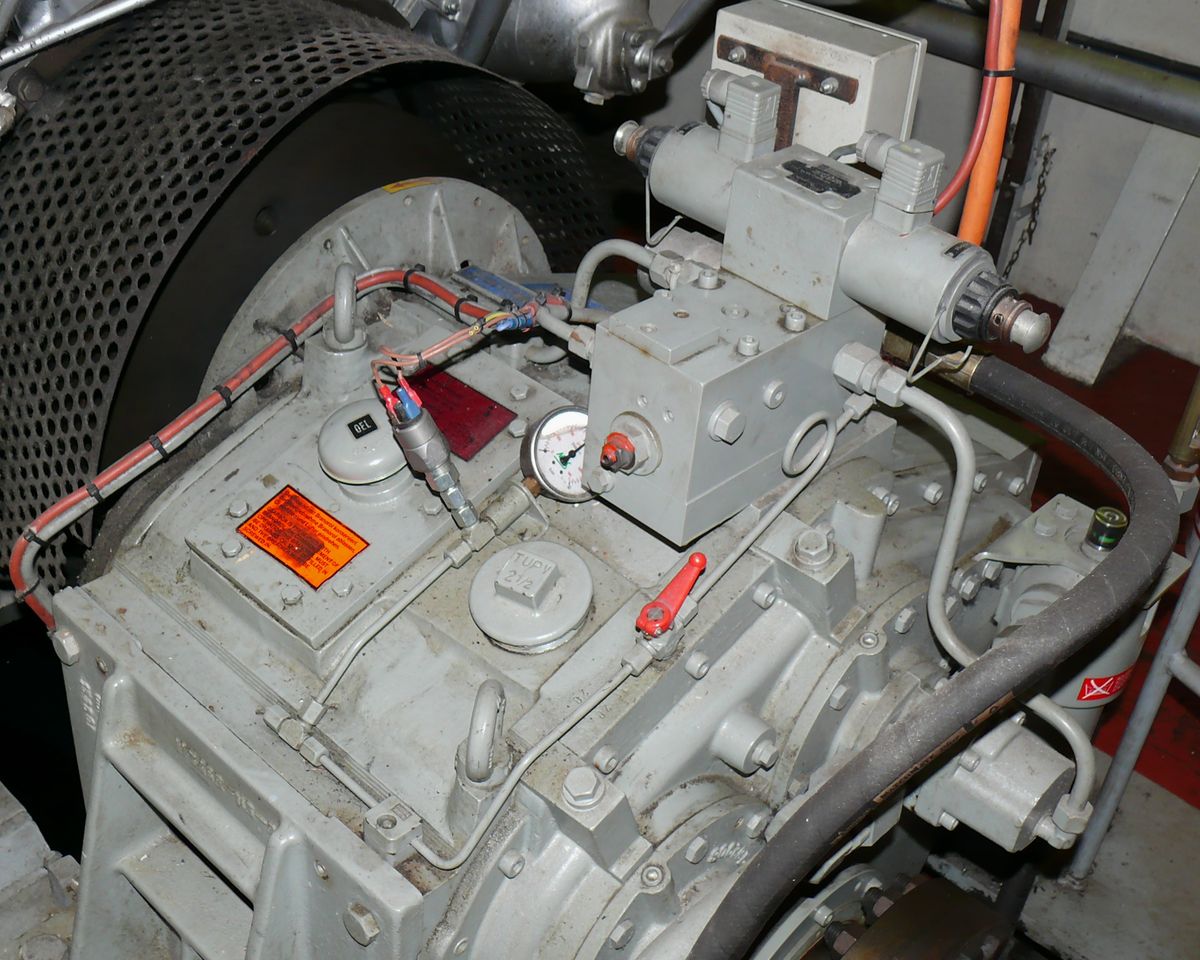 korthalskeerkoppeling. Op de voorgrond een machanische toerenteller van een Deutz SA8M517.