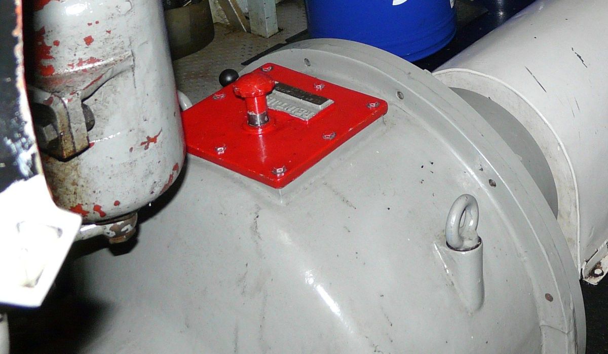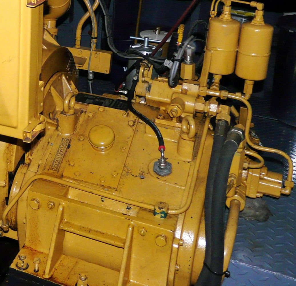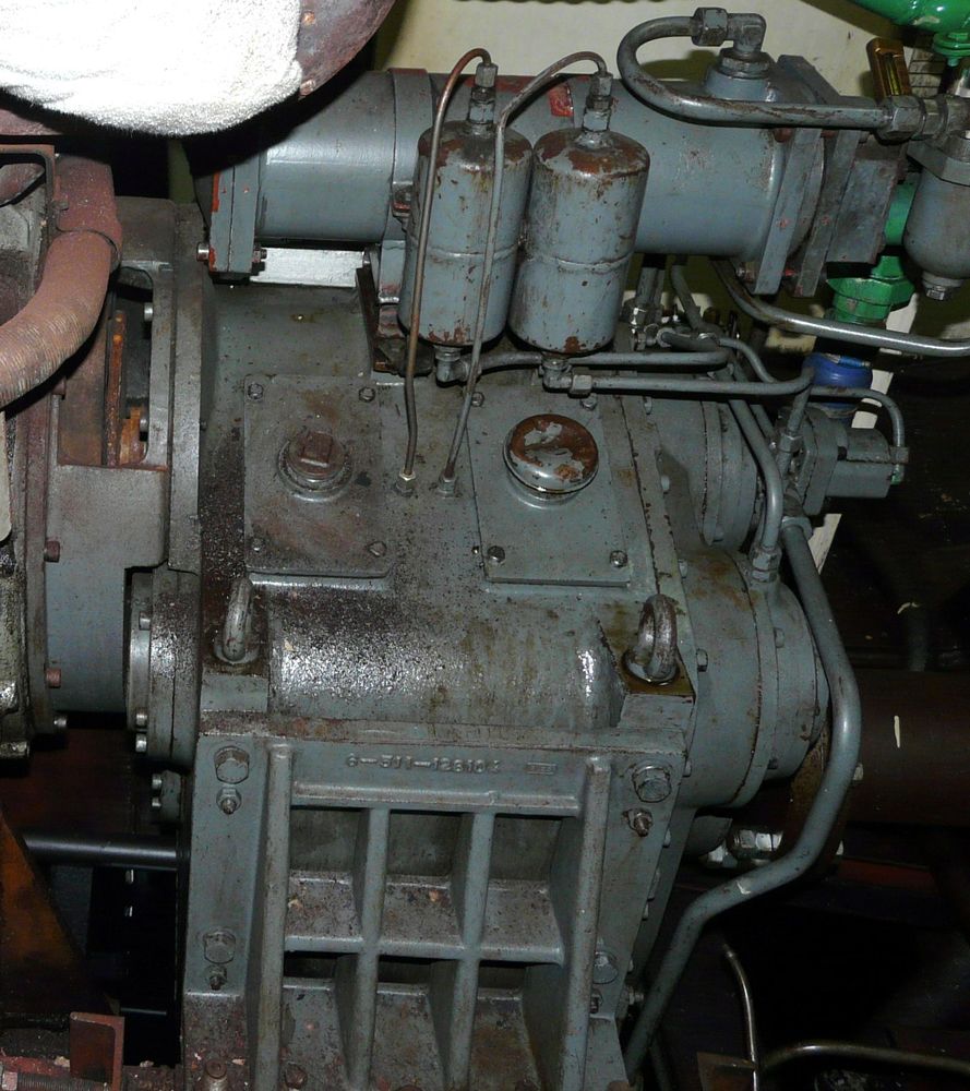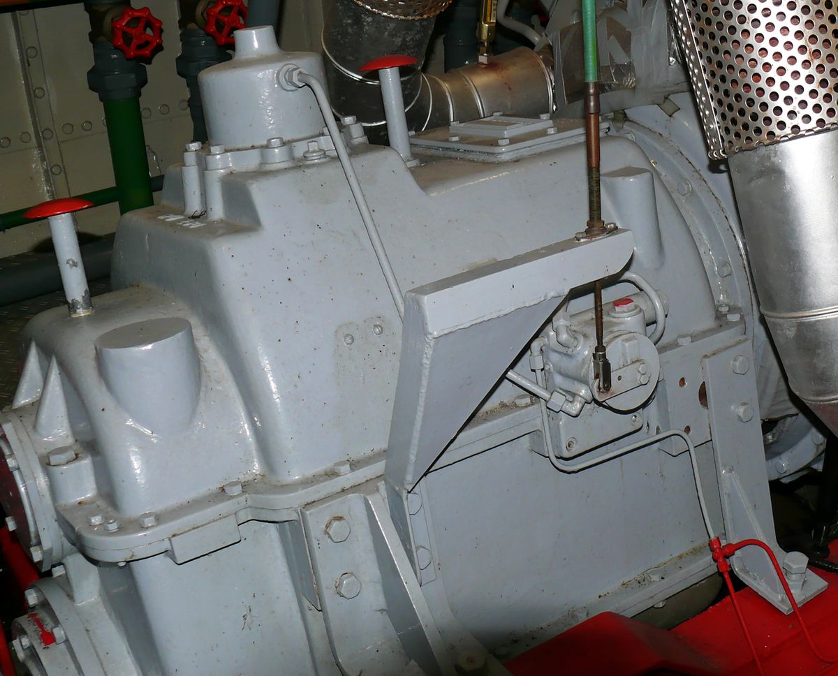 korthalskeerkoppeling. Op de voorgrond een machanische toerenteller van een Deutz SA8M517.