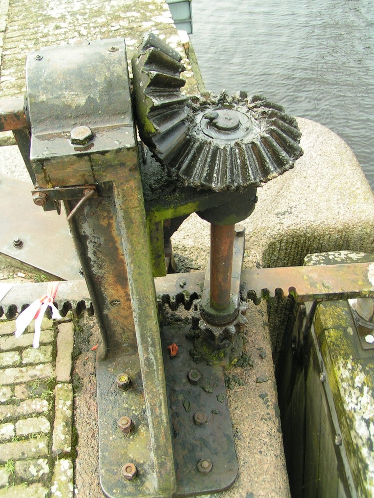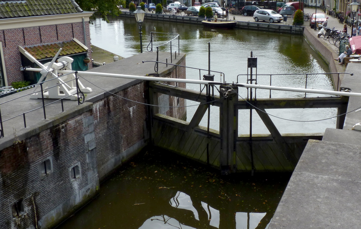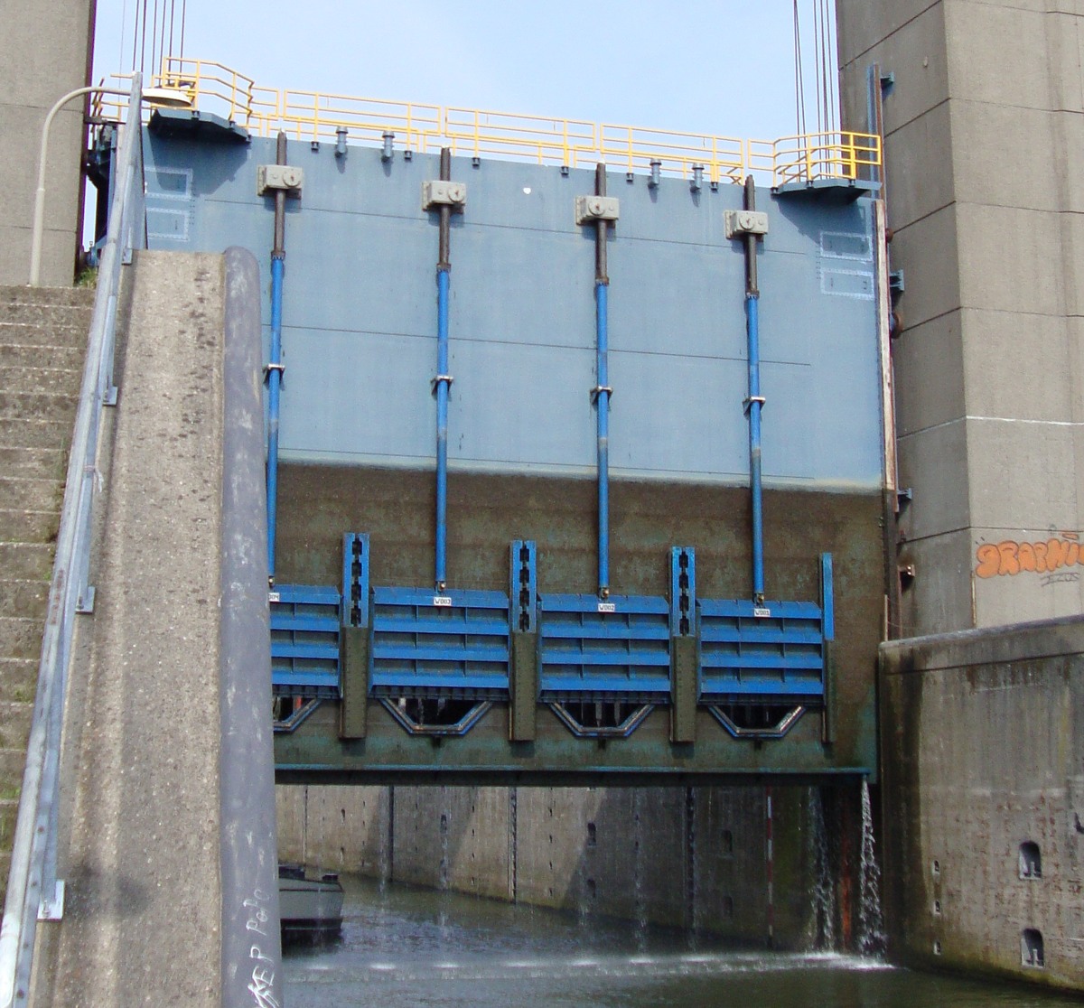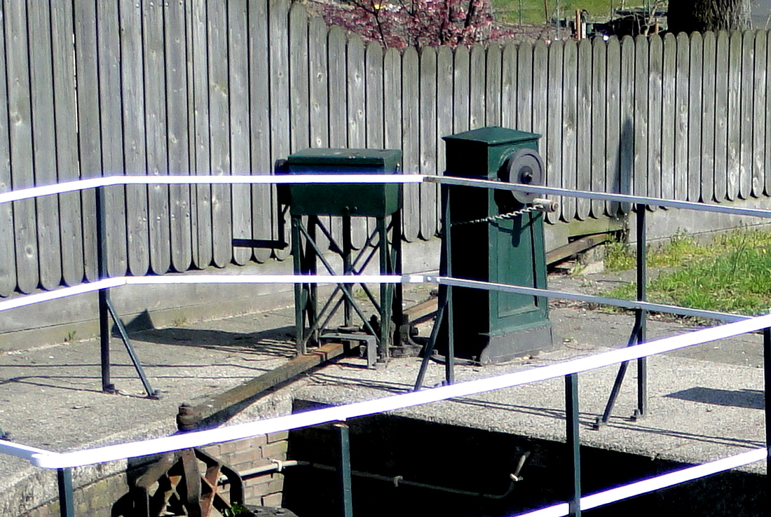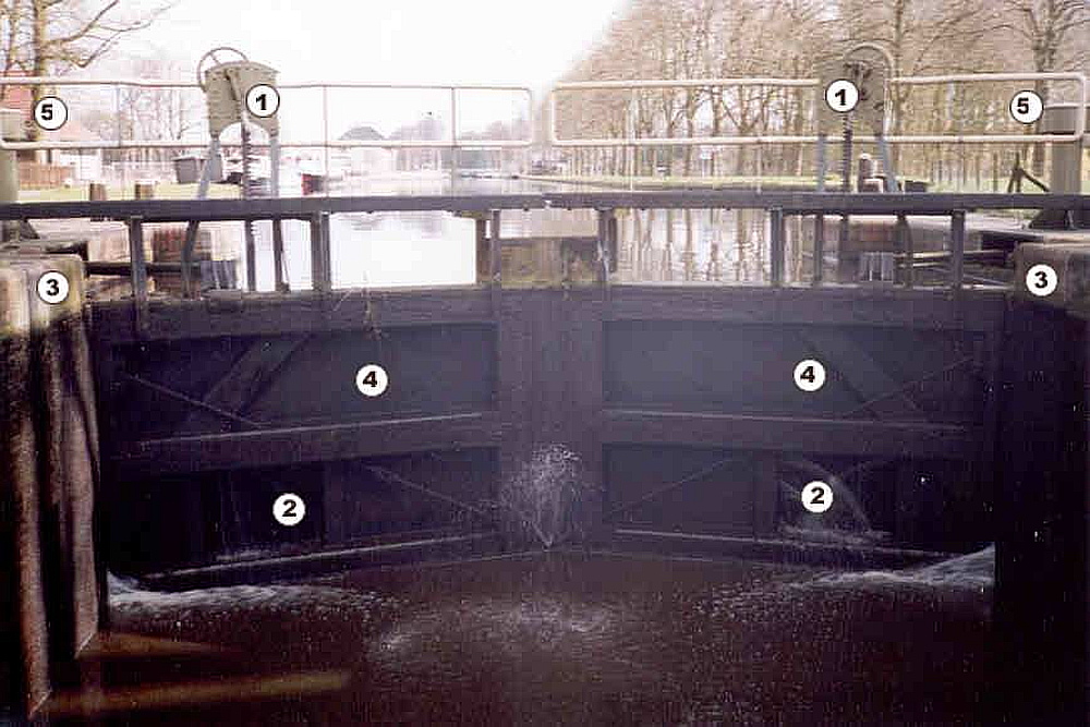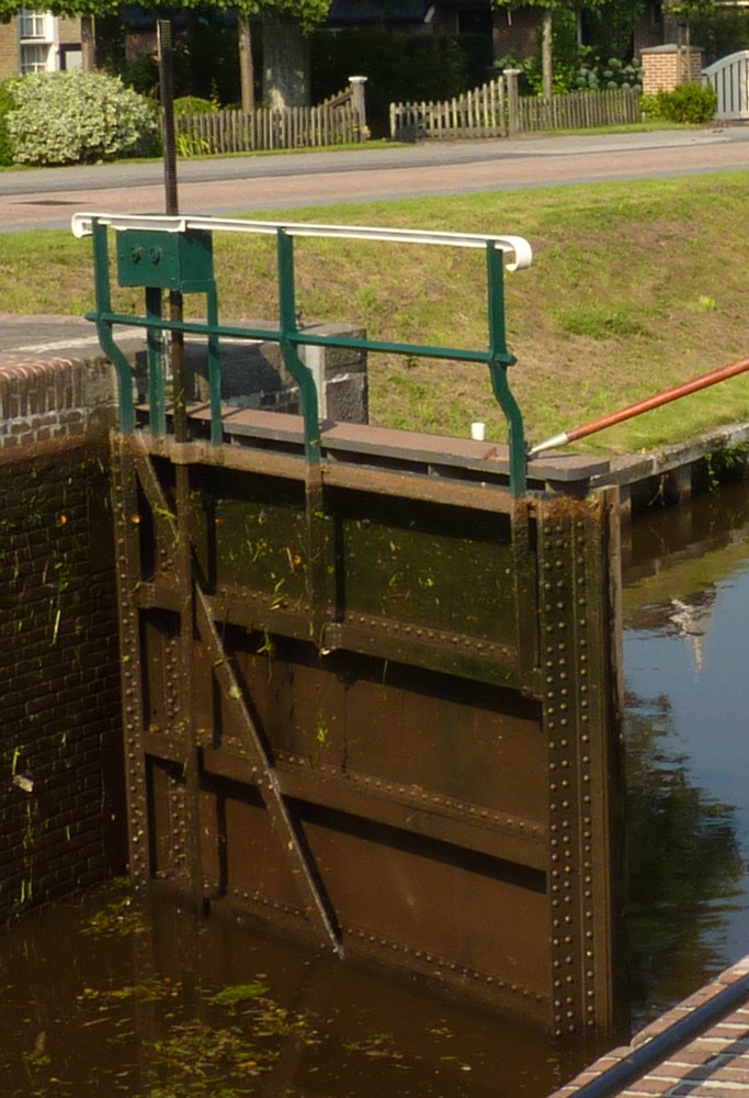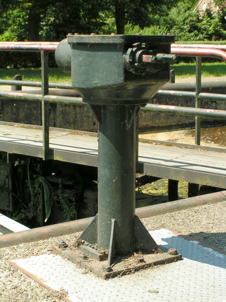 sluishoofd en vooral ook de deur wordt aan deze zijde beschermd door een merkwaardige paal; een '