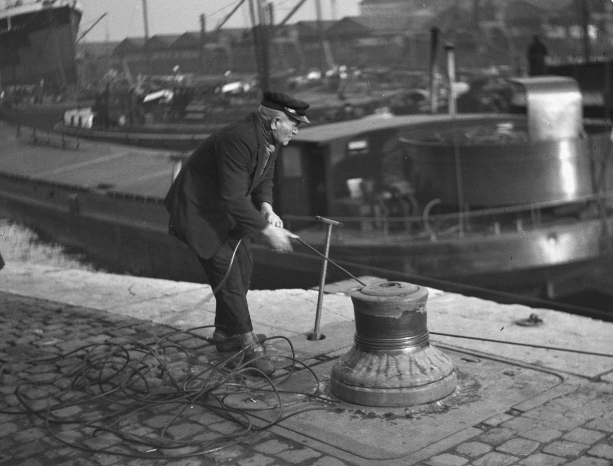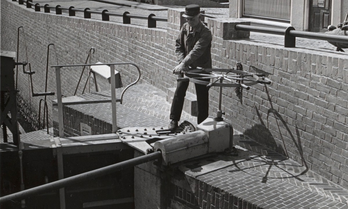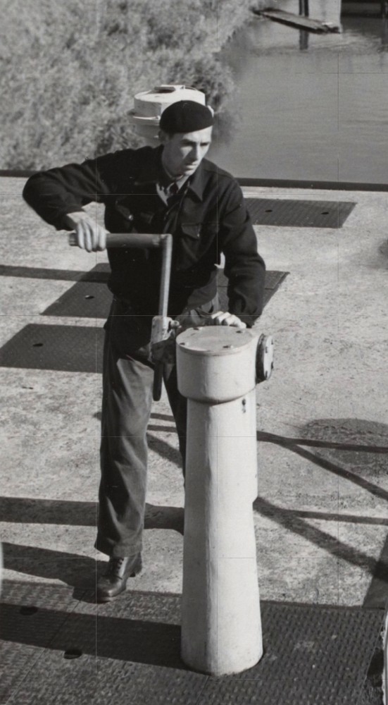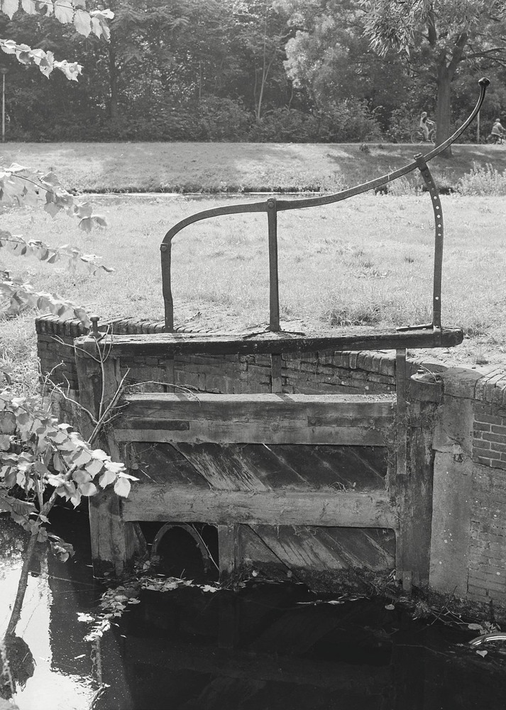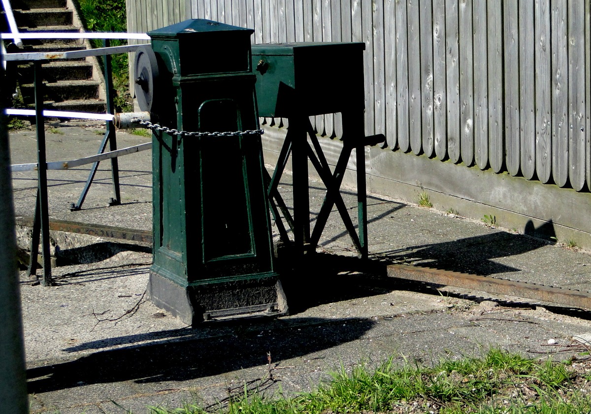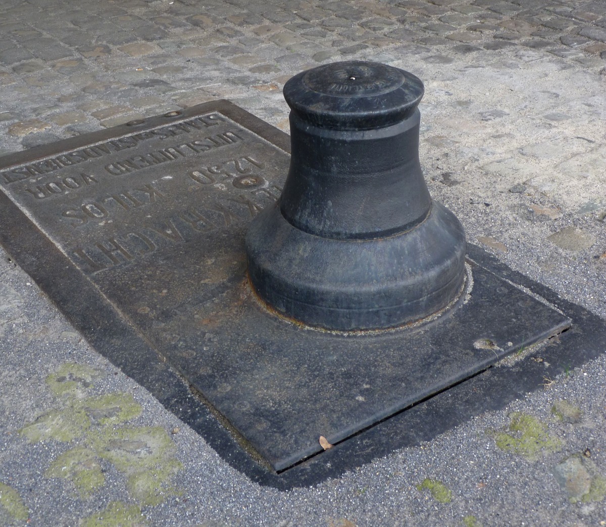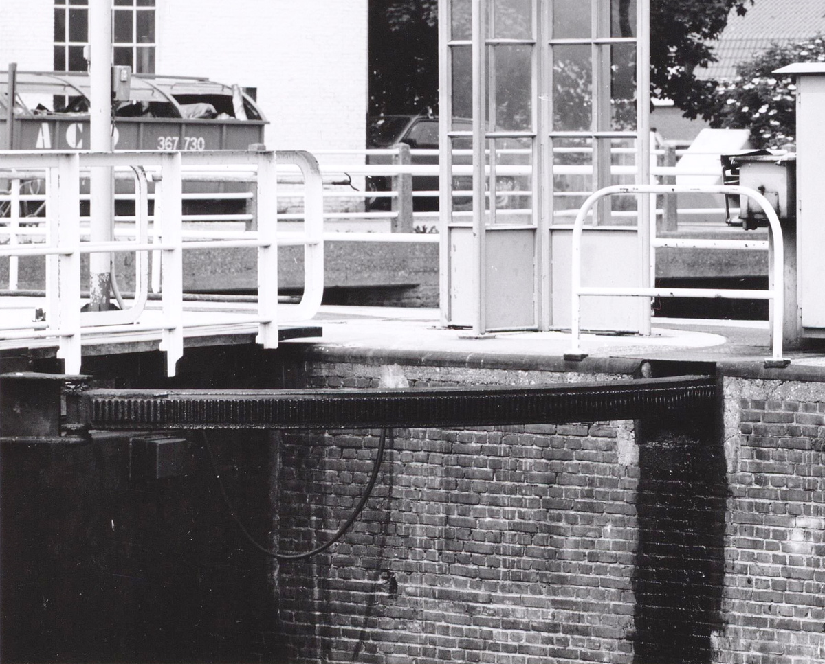 sluishoofd en vooral ook de deur wordt aan deze zijde beschermd door een merkwaardige paal; een '