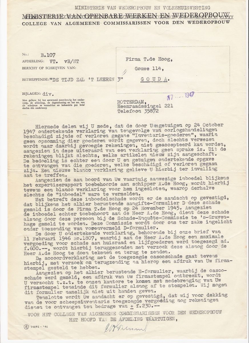Een brief van 17 november 1947 vermeldt dat de inboedelschade niet door