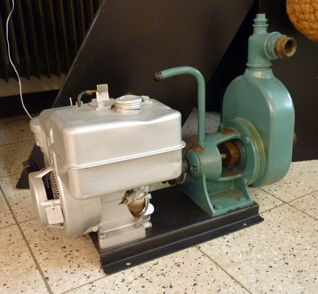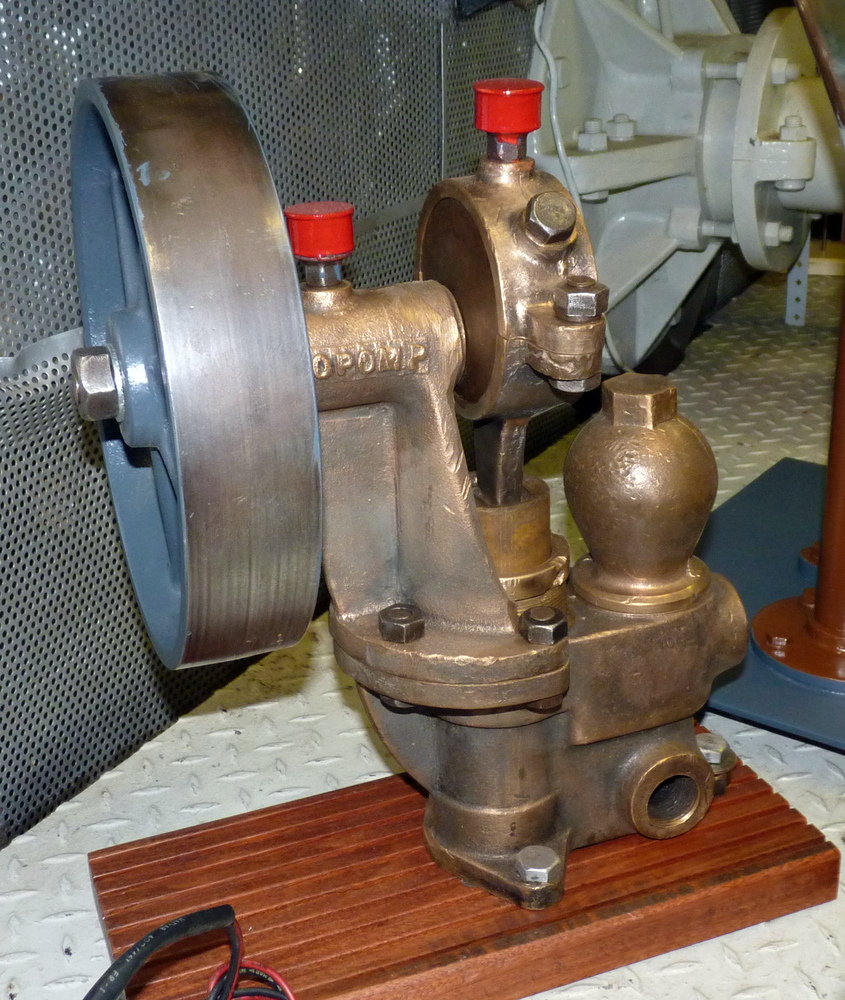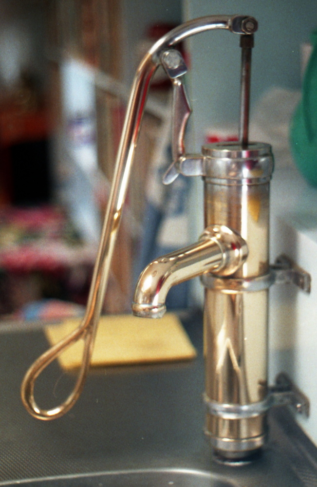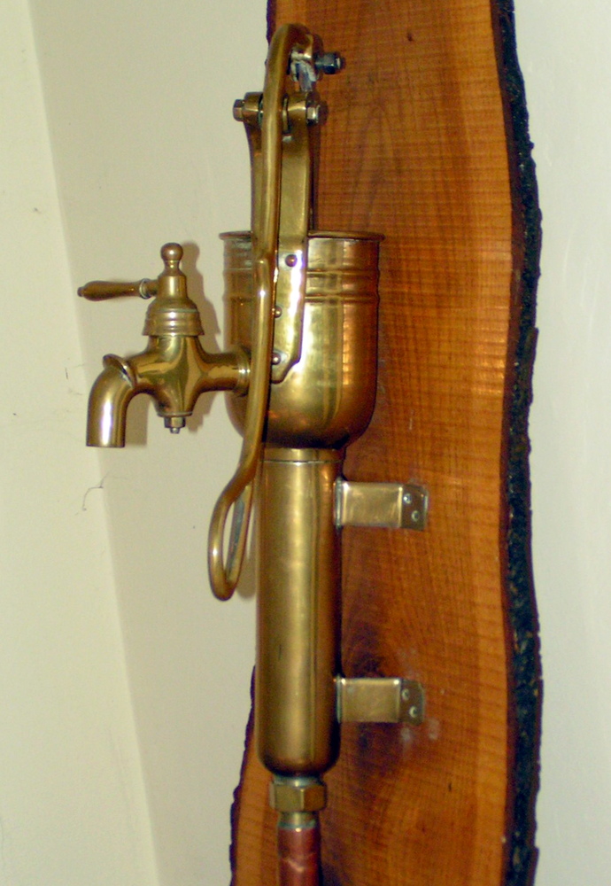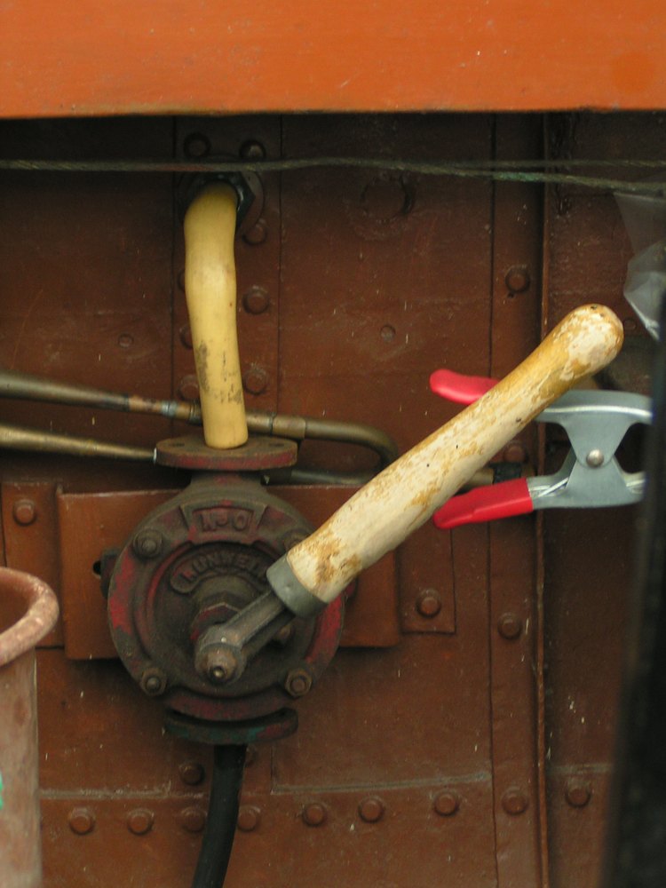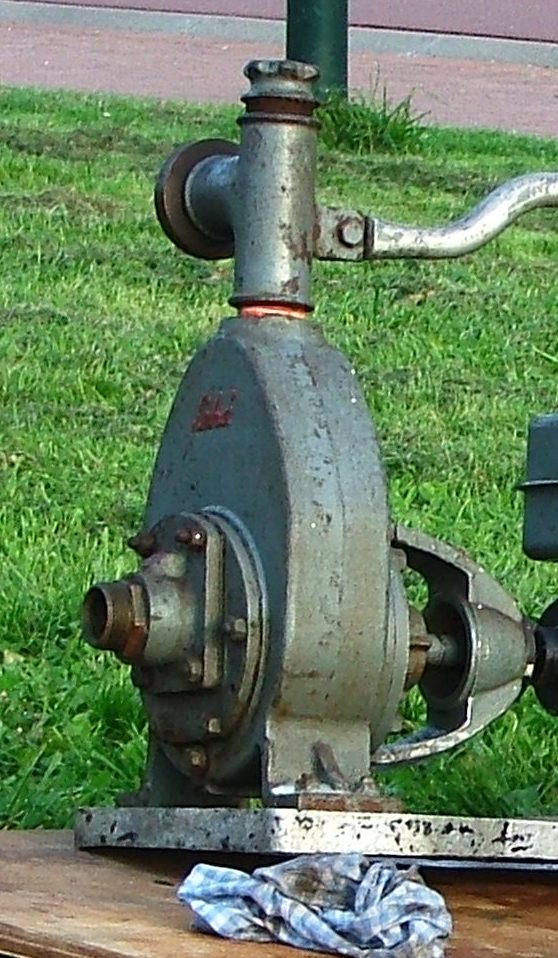 kattekop ingericht voor handbediening. De kleppen in dergelijke pompen bestonden vaak uit harde rubberen ballen. In dit geval is de, met veer bkrachtigde, bovenklep een, met metaal verzwaarde, rubberen schijf.