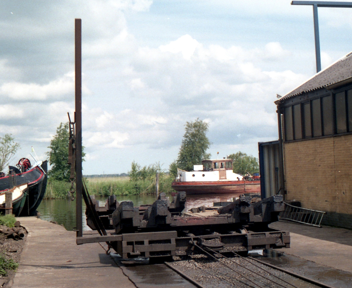 ligt. De stang wordt zo gezet dat wanneer het schip net niet tegen de stang aan ligt, het schip midden boven de kar is. De achterste kar moet ongeveer bij het