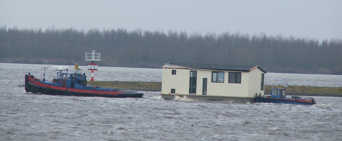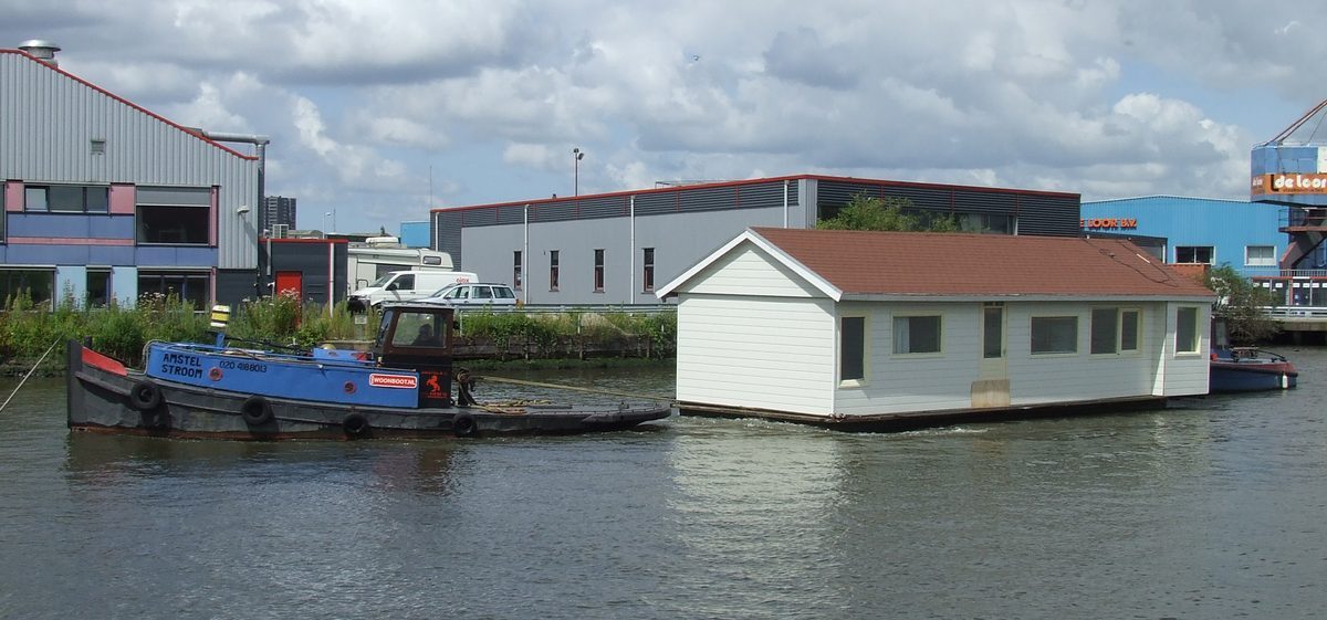 Sleepboot 'Amstelstroom' sleept een aardige woonark.