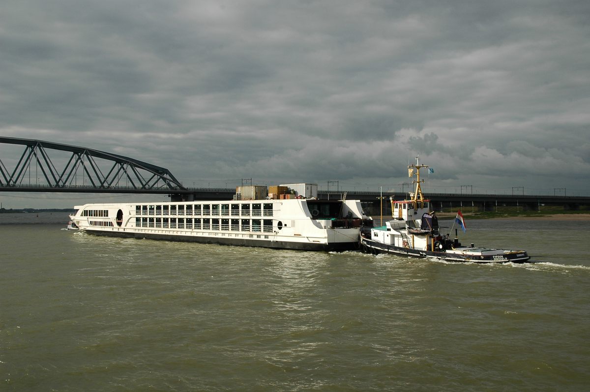 Een onbekende sleepboot aan de achterzijde fungeert als 'dynamisch roer'.