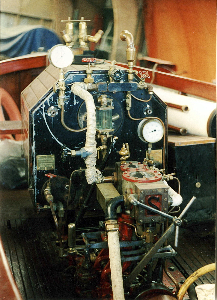 Een kleine Stuart stoommachine met ketel als voortstuwing in een klein open vaartuig;