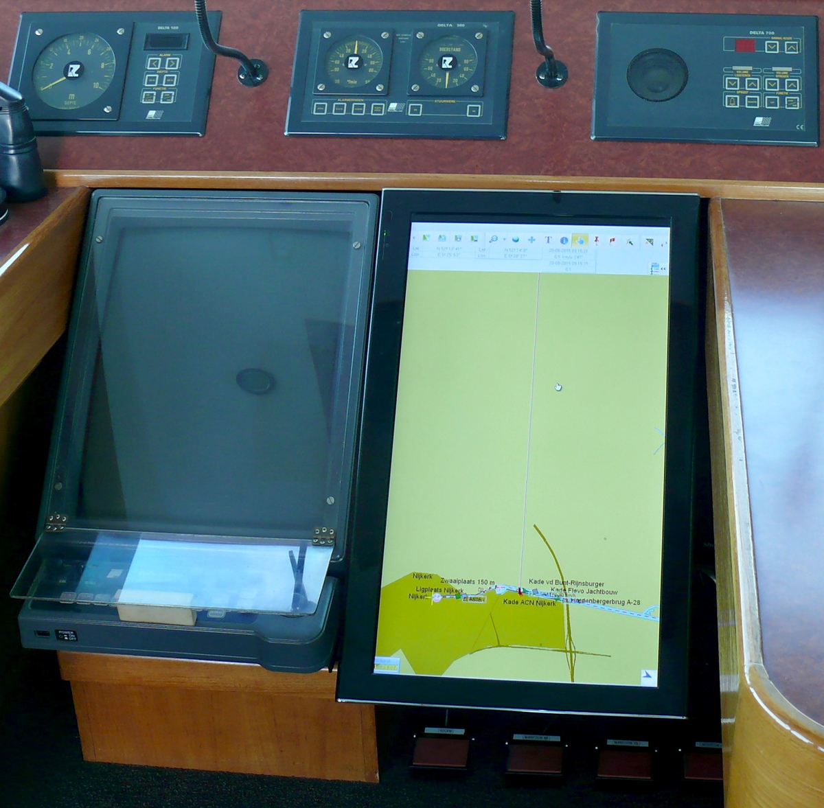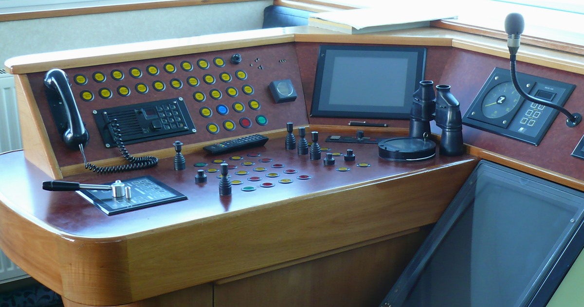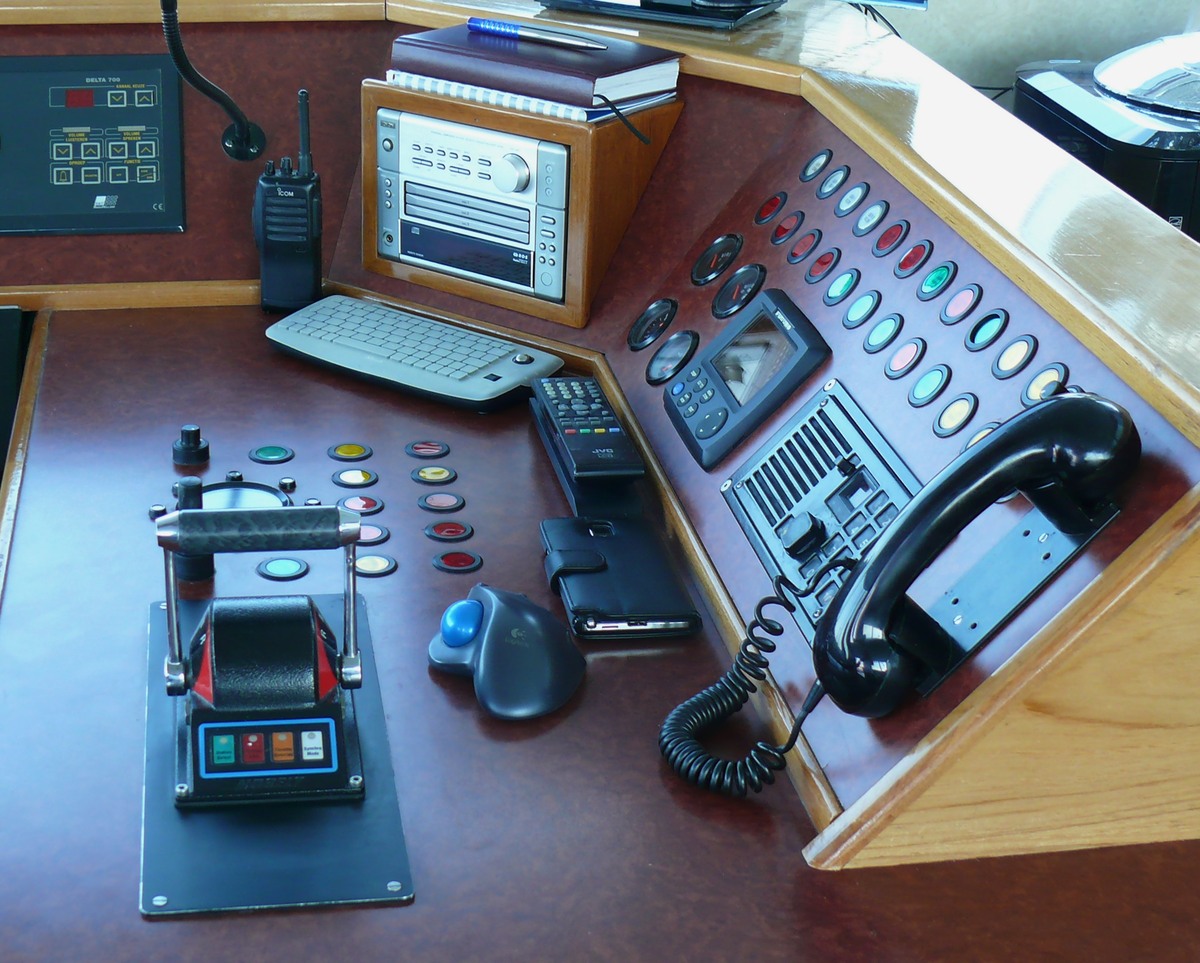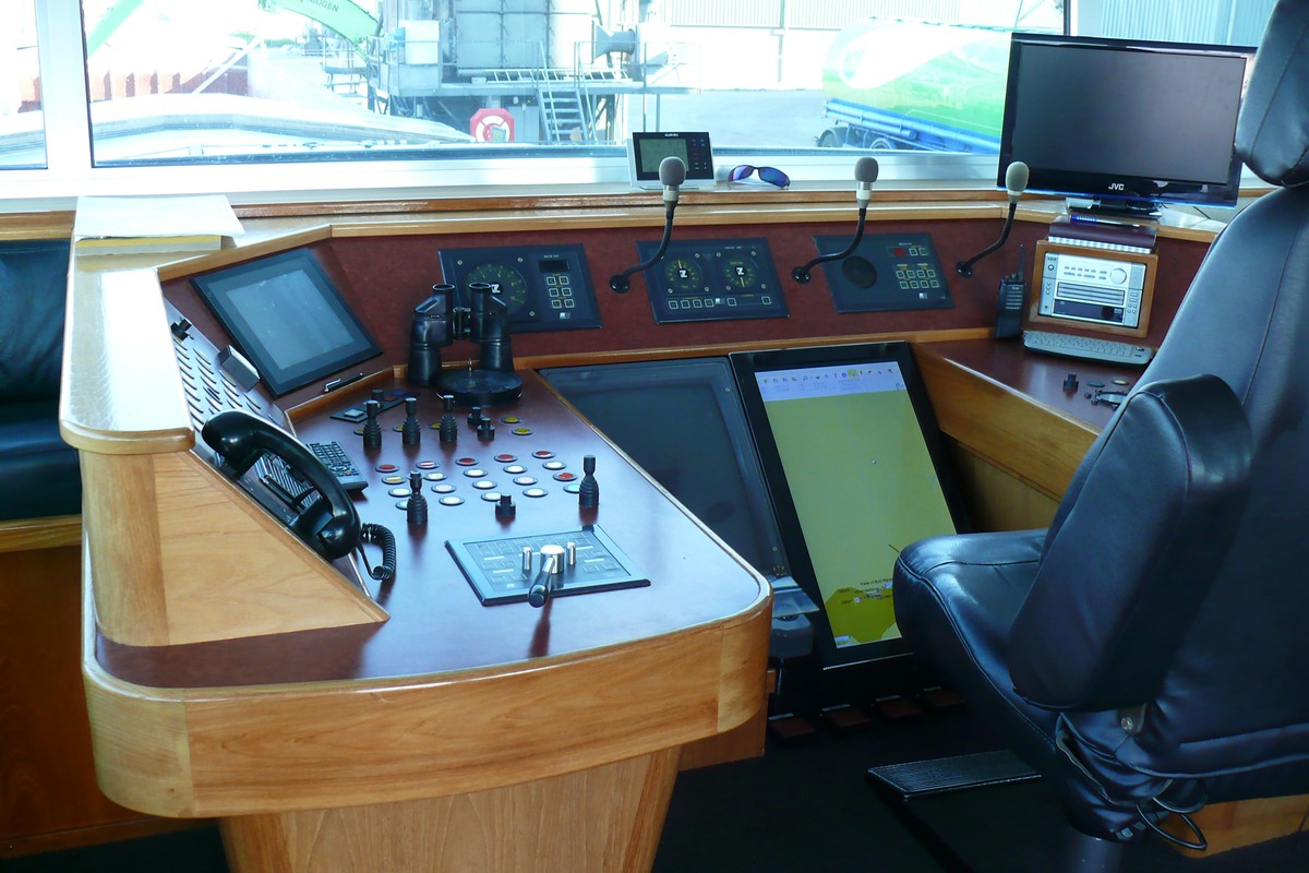 vaartijdenmeter, daarachter in de schuine wand, vermoedelijk het aanraakscherm waarvoor is me niet bekend, maar aangezien ik het bekende instrumentenpaneel van de hoofdmotor mis, zou het daarmee wel eens te maken kunnen hebben.