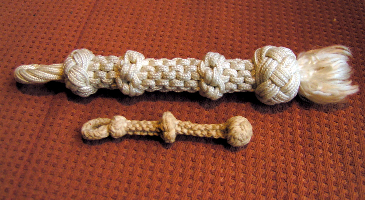 Een superkleine en een grote marlpriem. De grote is afgewerkt met een zesstrengs Turkse knoop, de kleine met een driestrengs.