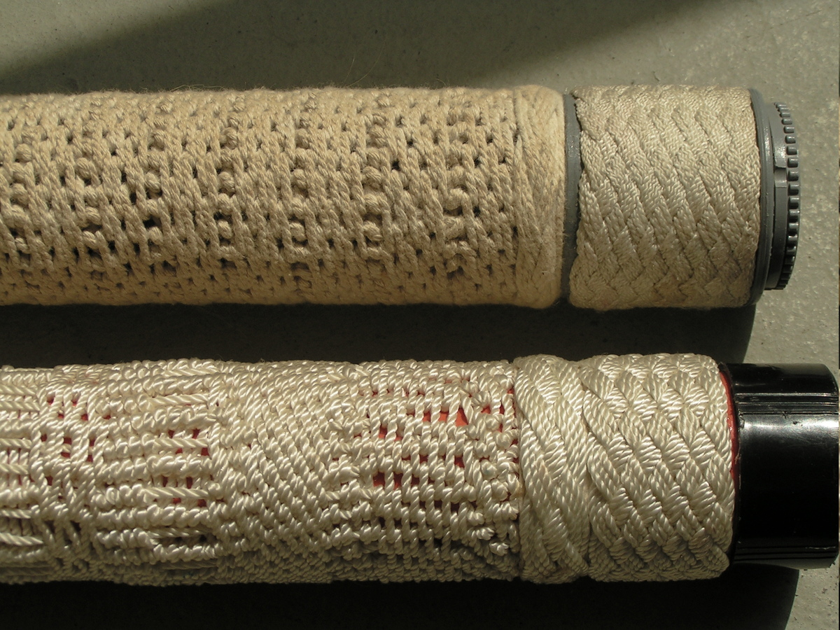 Kokers voor het opbergen van lange dunne, eventueel kwetsbare, voorwerpen bekleed met katnings en Turkse knopen. Het onderste is een soort 'stalen kaartje' van mogelijke katnings.