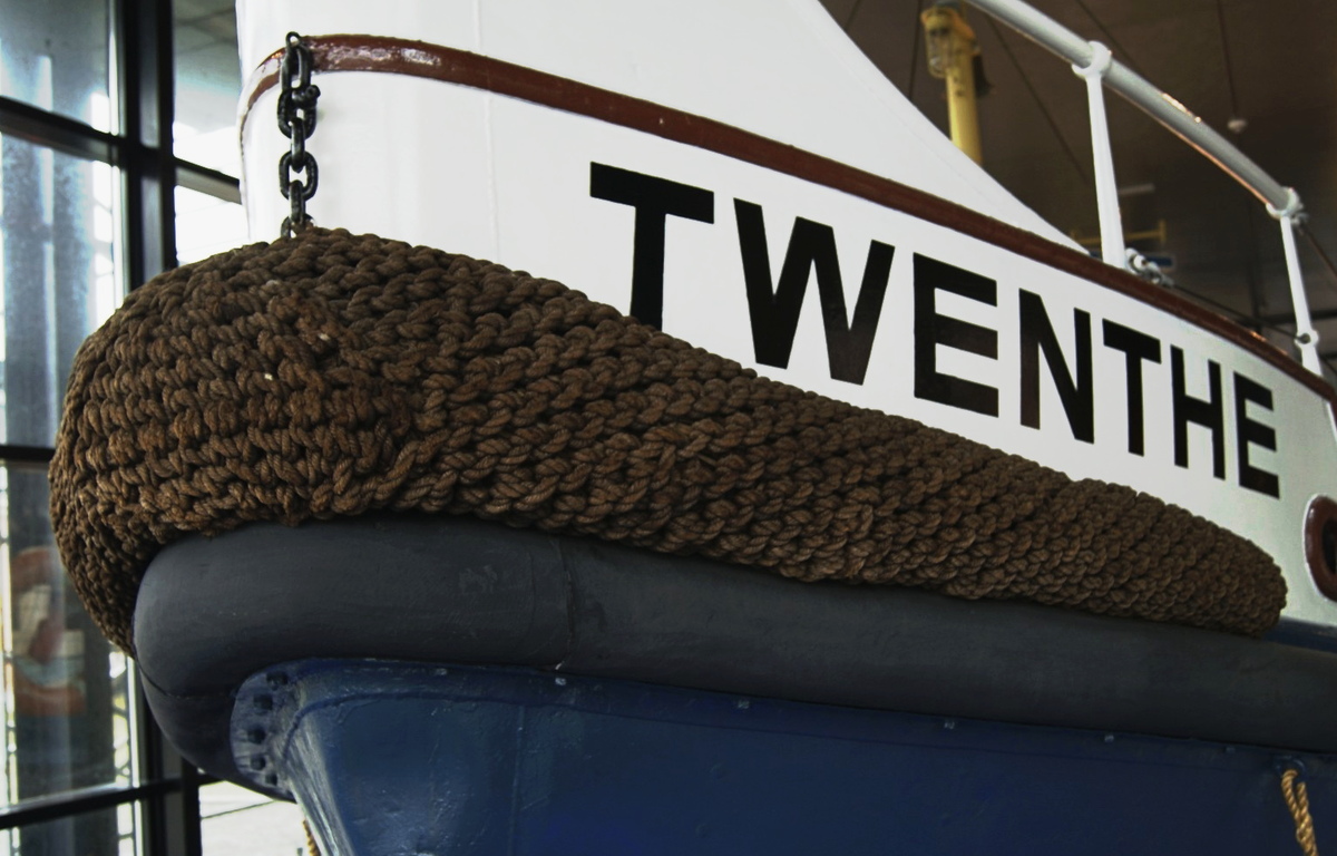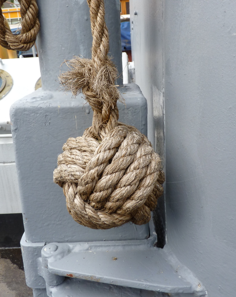 Het eenvoudigw belletouw, aan boord van de Damco 9, bestaat grotendeels uit een herhaling van kruisknopen.