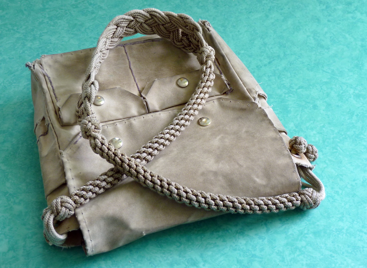 Een, tot op de draad versleten, schoudertasje met een draagband geknoopt van nylonkoord.