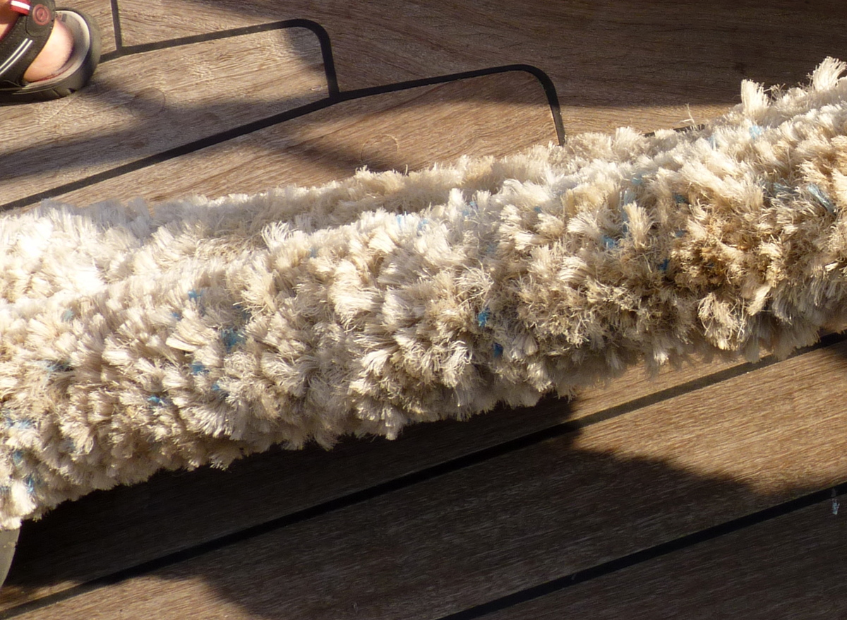 Twee staaldraden, ter bescherming van de zeilen, omwikkeld met een schurftplatting.