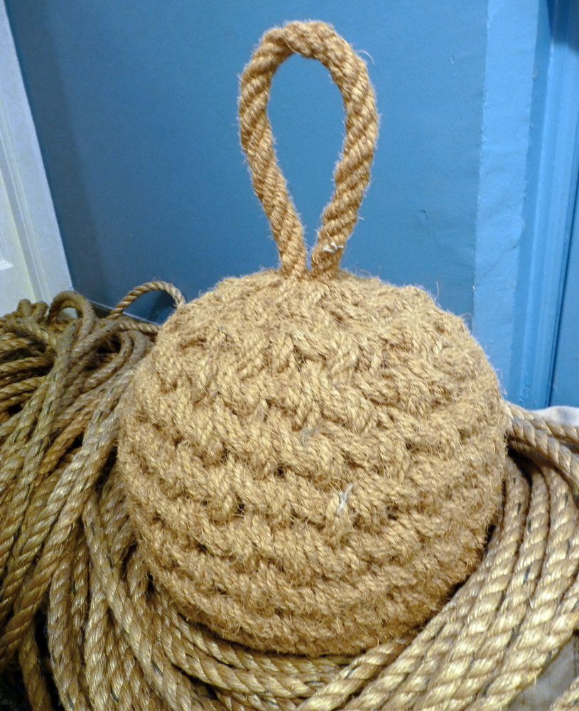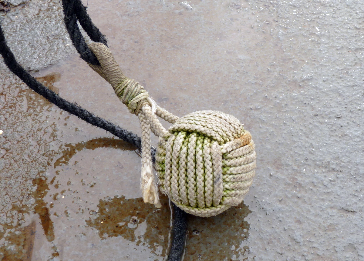 (een flinke stalen moer) goed verpakt in een werpknoop,
