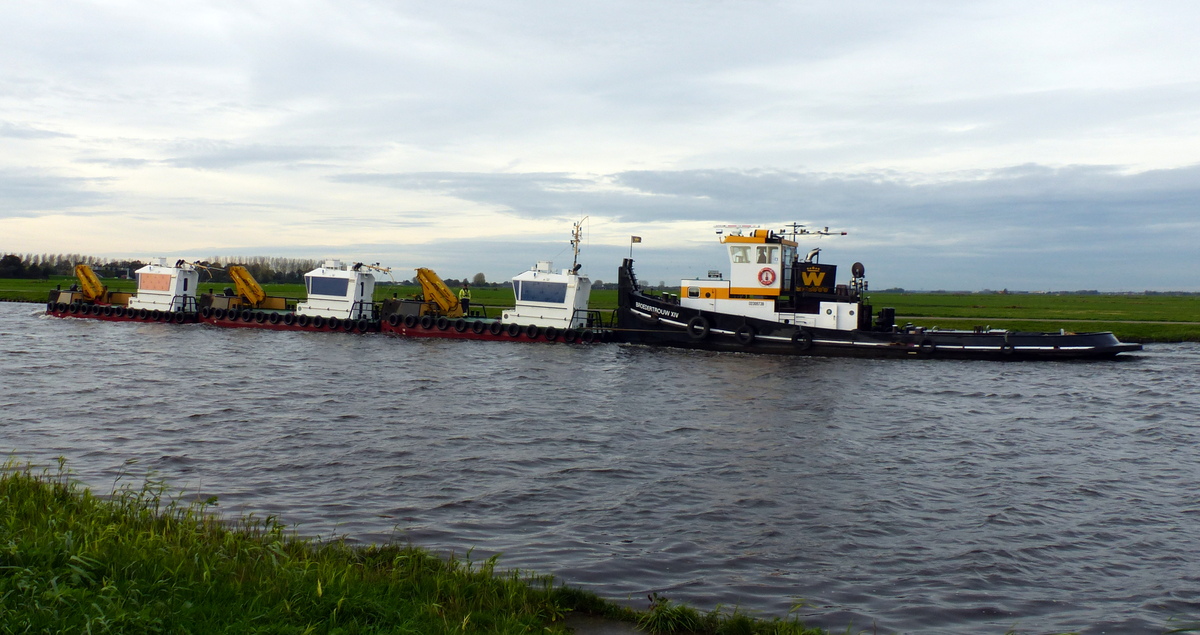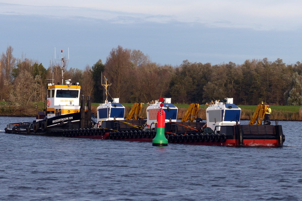 Het transport van materieel voor StaatsBosBeheer. Pontonschip 'Greate Griene'.