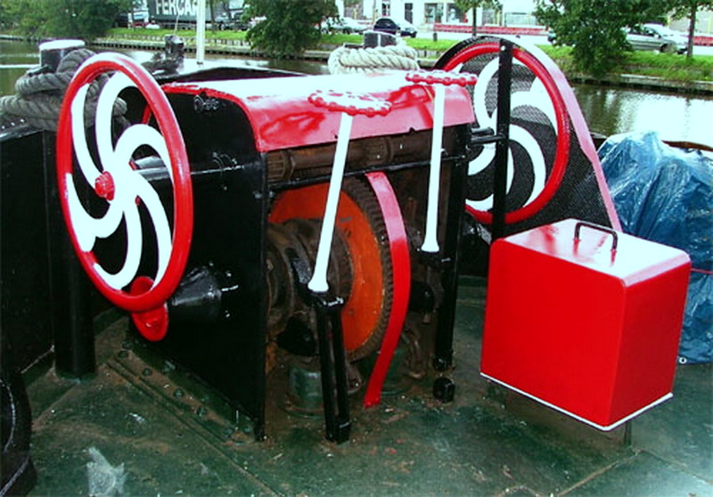 Watergeus. Het ankerlier wordt, via een V-snaar, door een Brigs & Stratton benzinemotor aangedreven. Deze motor zit onder de rode kist.