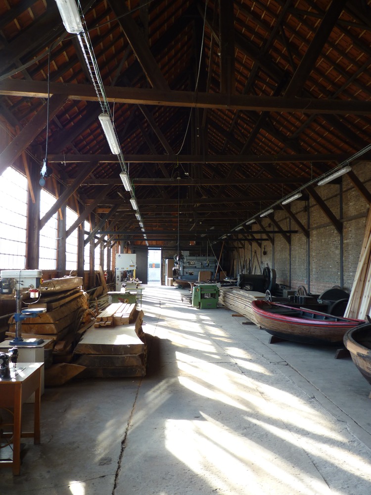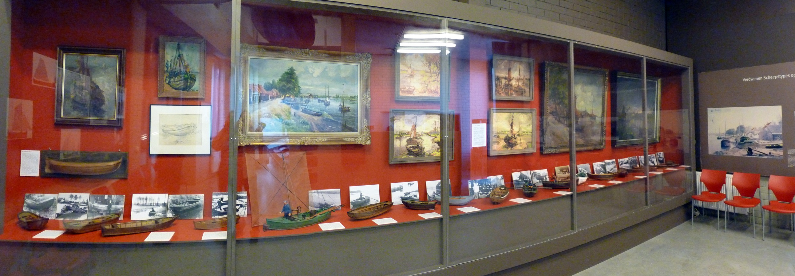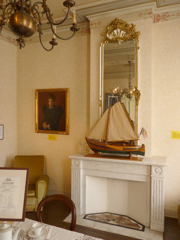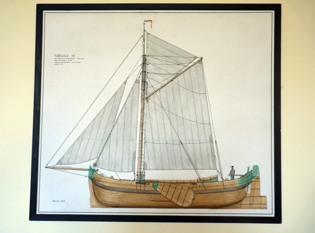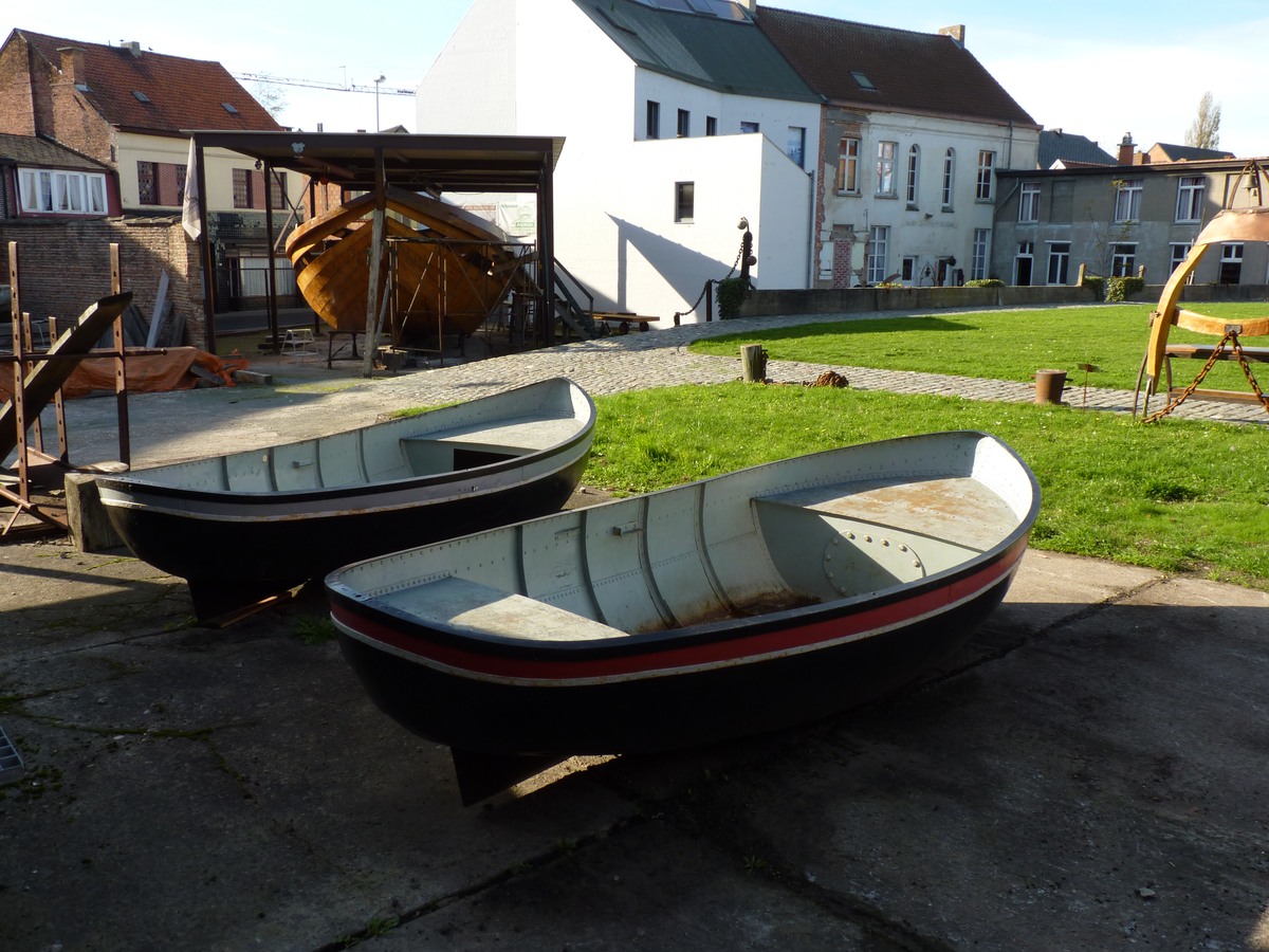 Op de achtergrond ziet men het herenhuis van Van Damme. Links daarvan de nieuwbouw, waarin een groot deel van de museumcollectie geherbergd is. Daarnaast ziet men de botter Rosalie in aanbouw. [