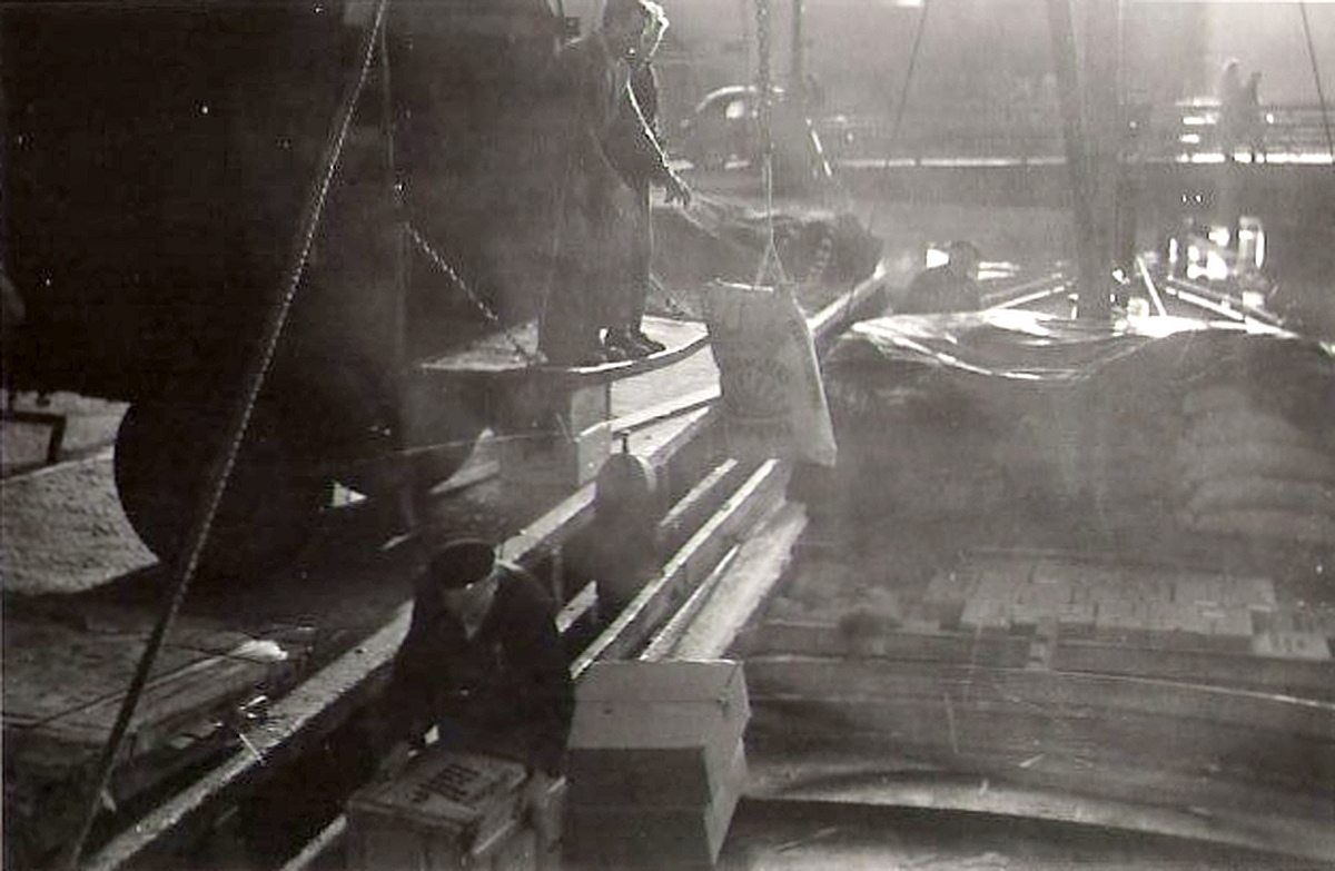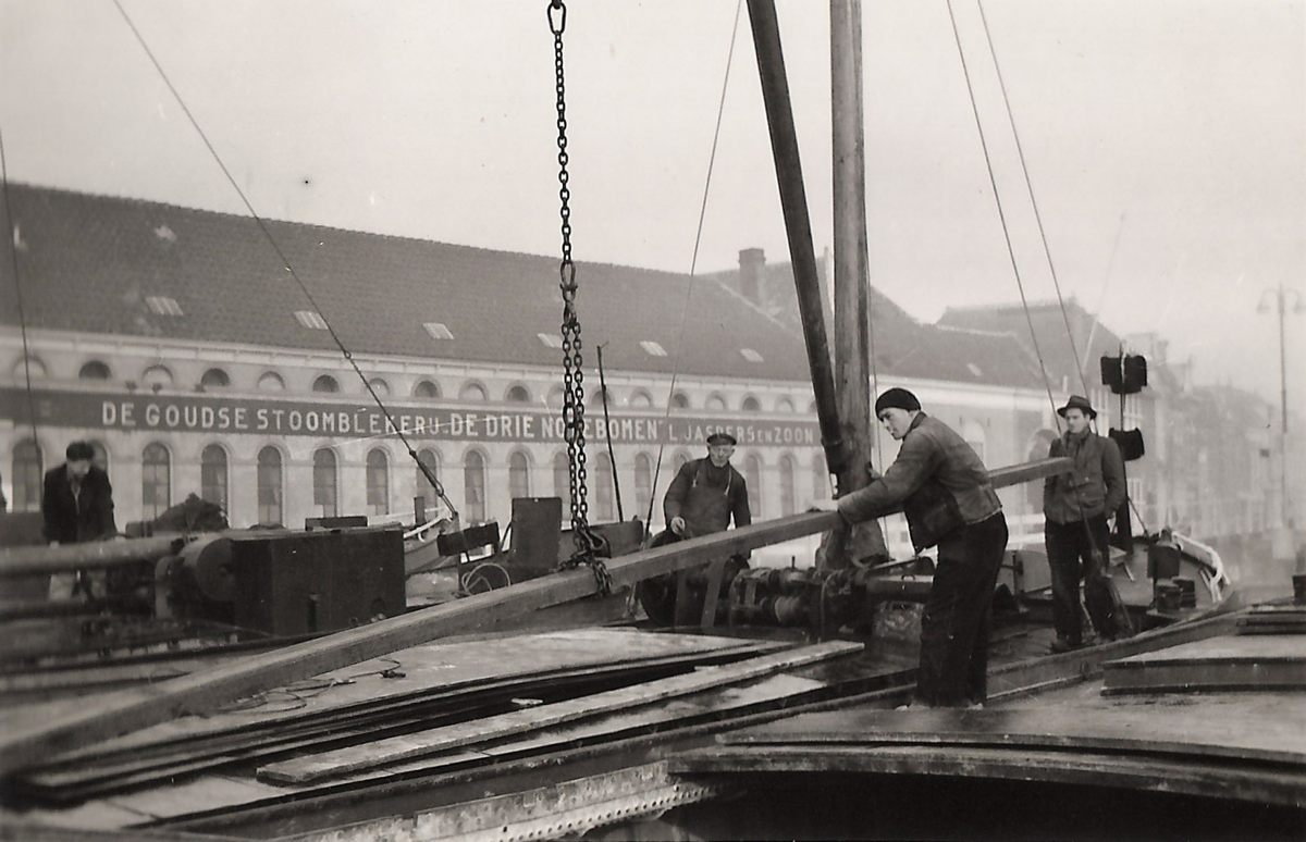 Het lossen van een vat met behulp van een walkraan. Rechts het gebouw van 'De Verenigde'.