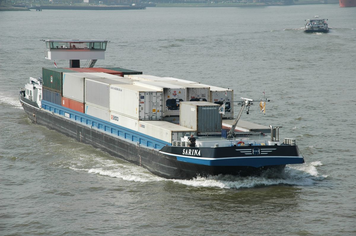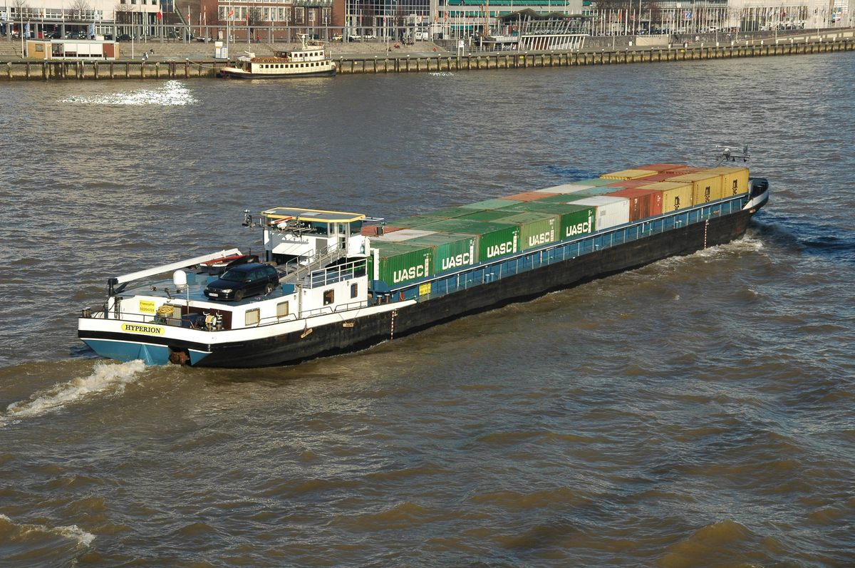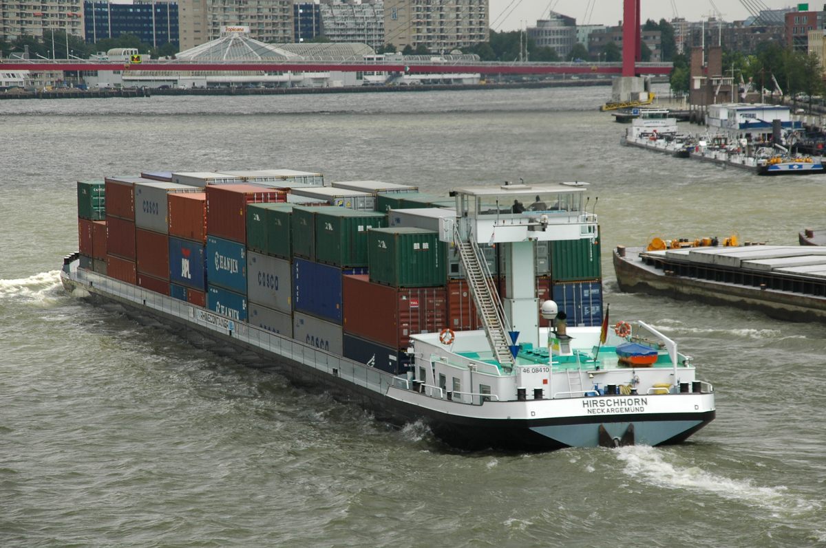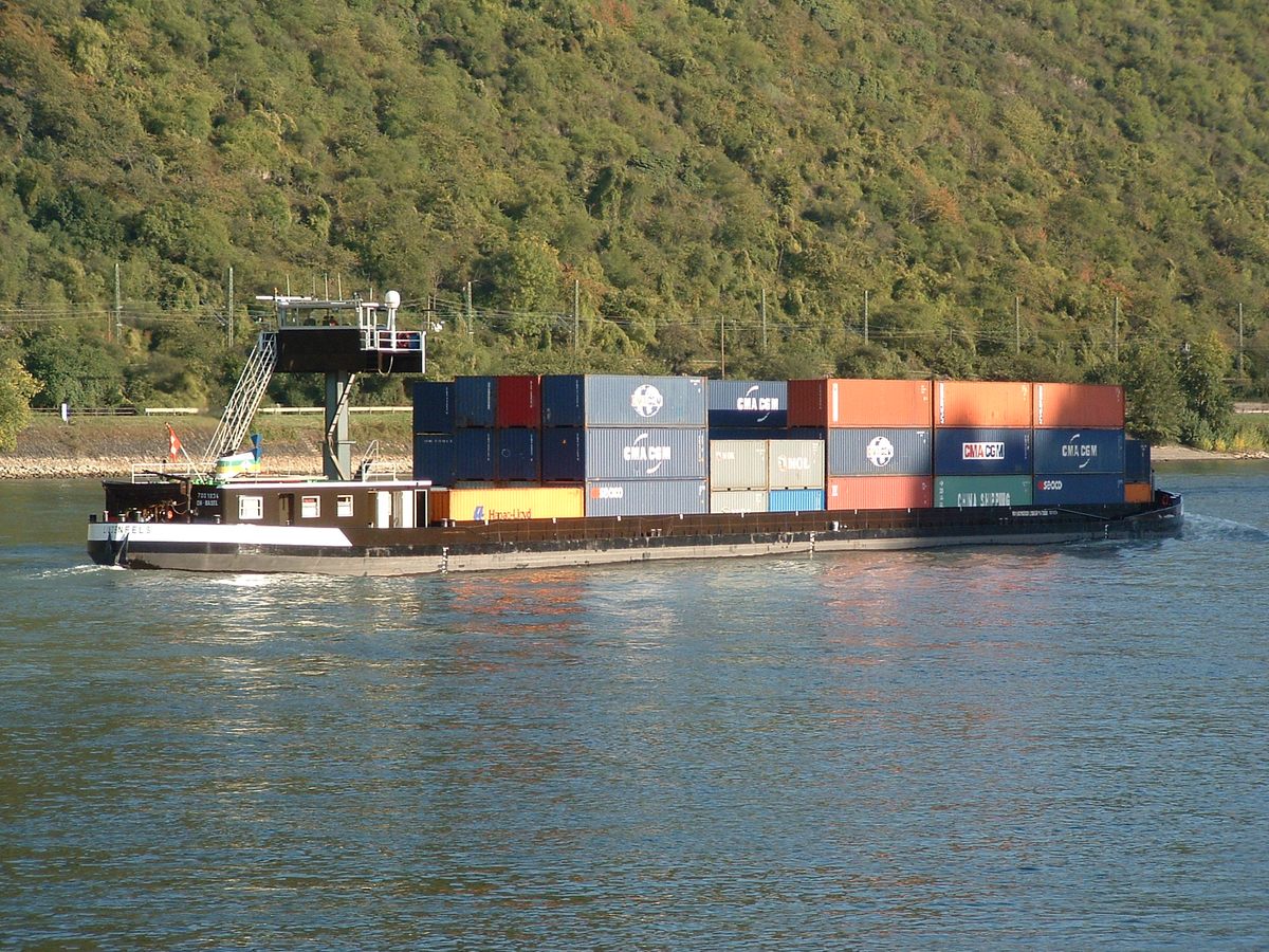 De 'Lindenfels' varend op de Rijn met een flinke lading containers. Daar containerschepen tijdens hun reis soms meerdere havens aan doen en in elke haven zowel containers