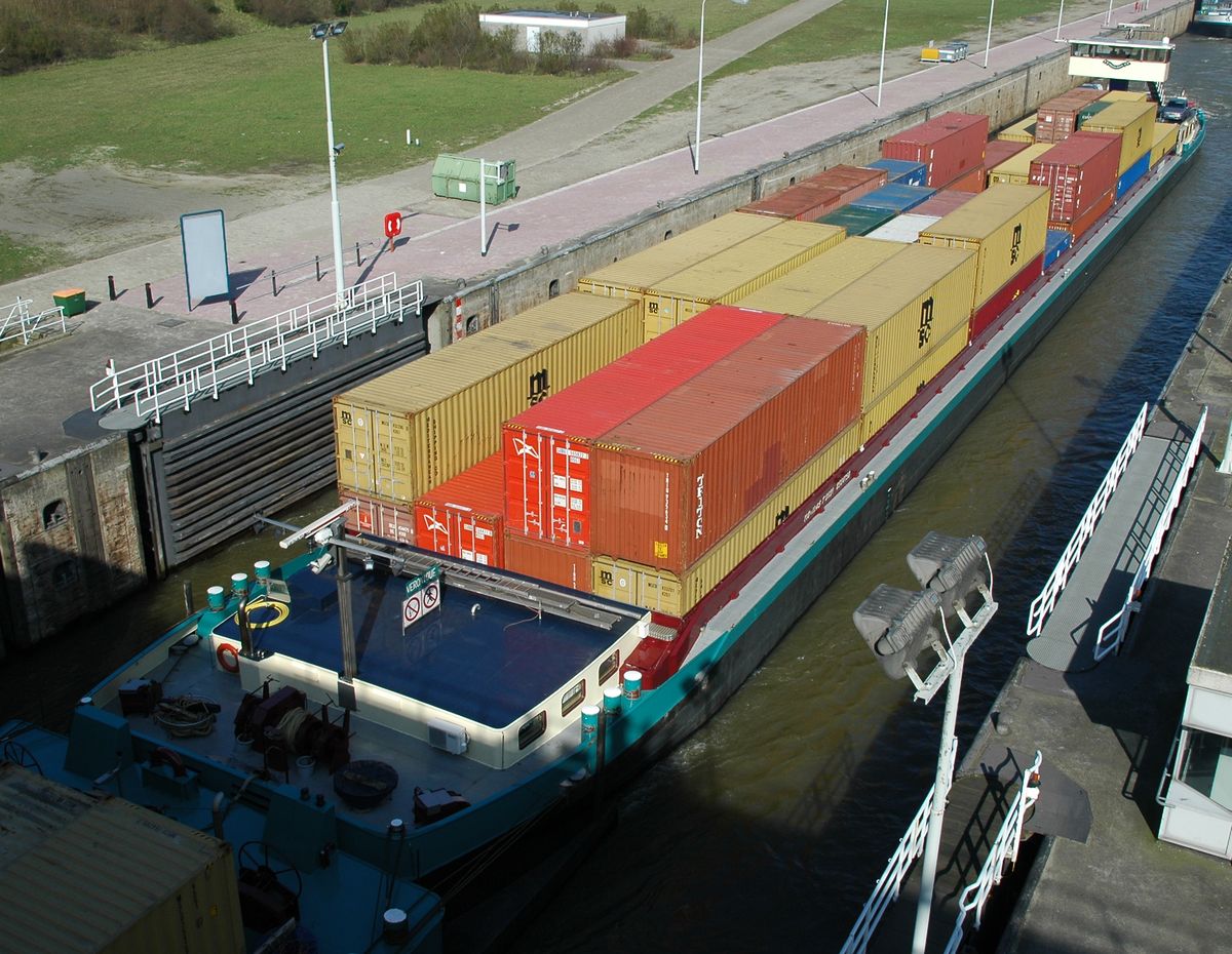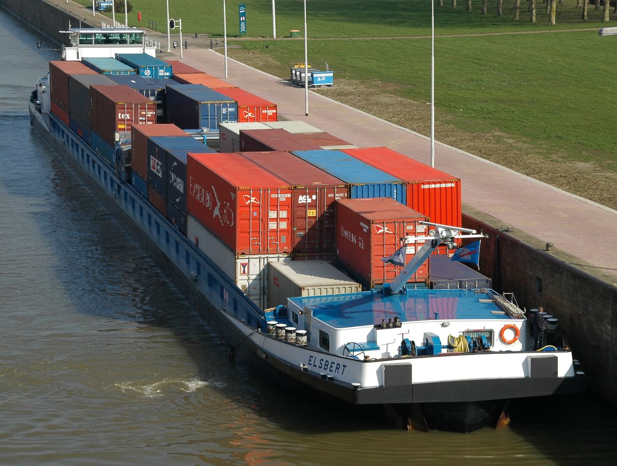 Het duwschip 'Vision' met daarvoor de gelijknamige 'bak'. Let op hoe de