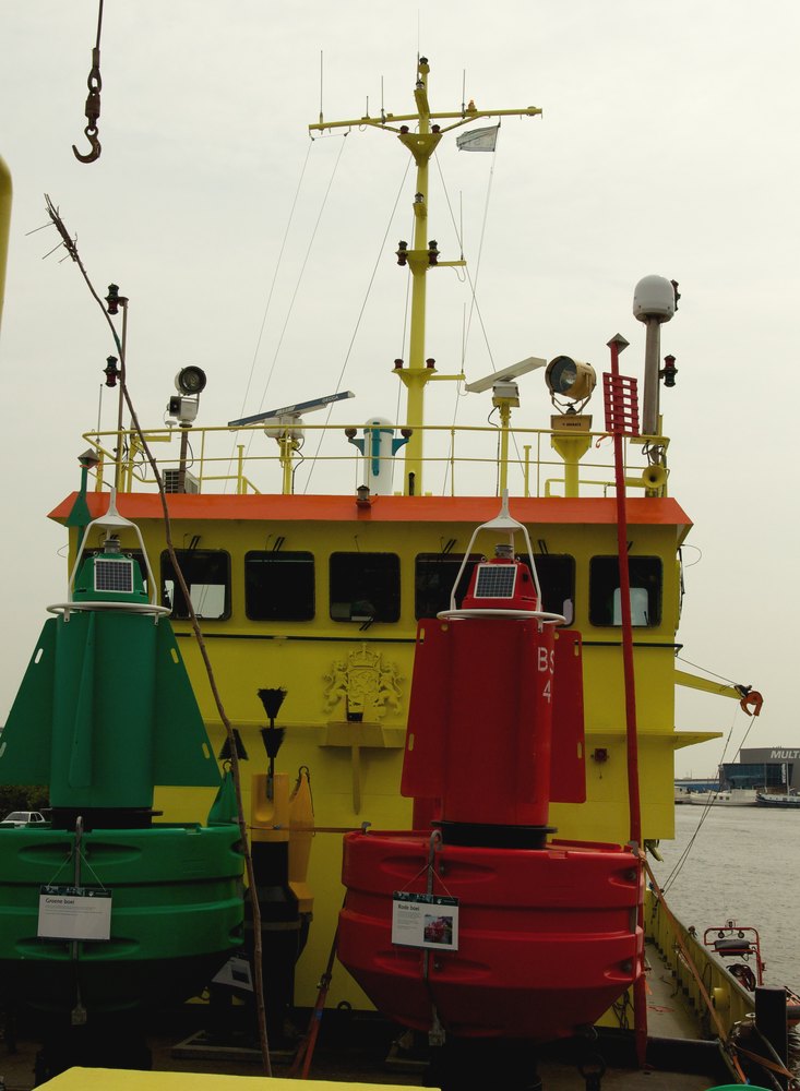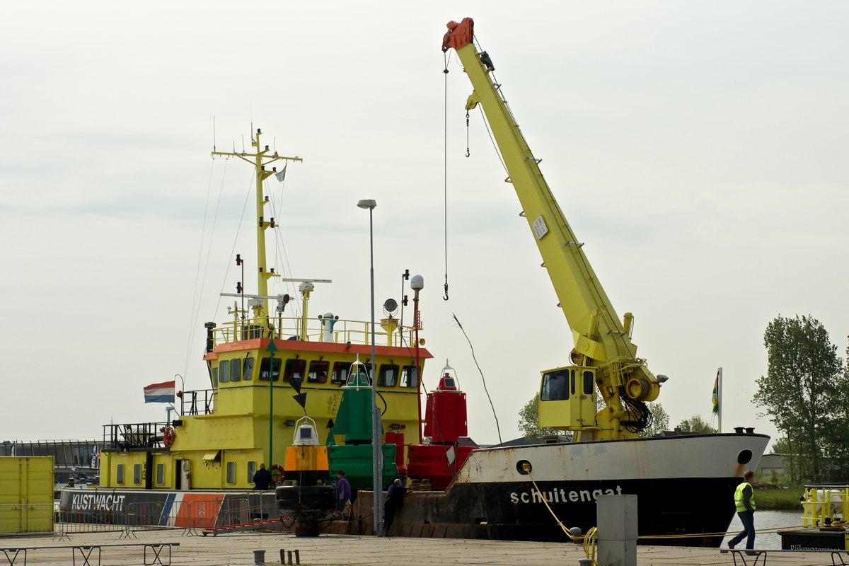 Betonningsvaartuig 'Schuitengat' met aan boord de, toen nog, nieuwe kunststof boeien.