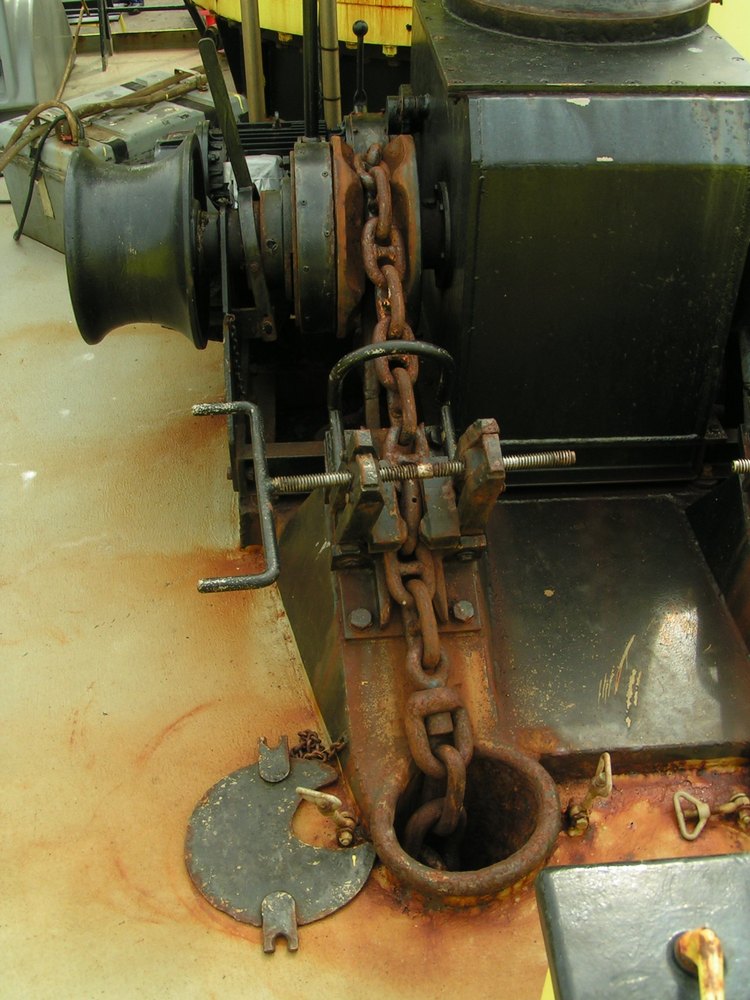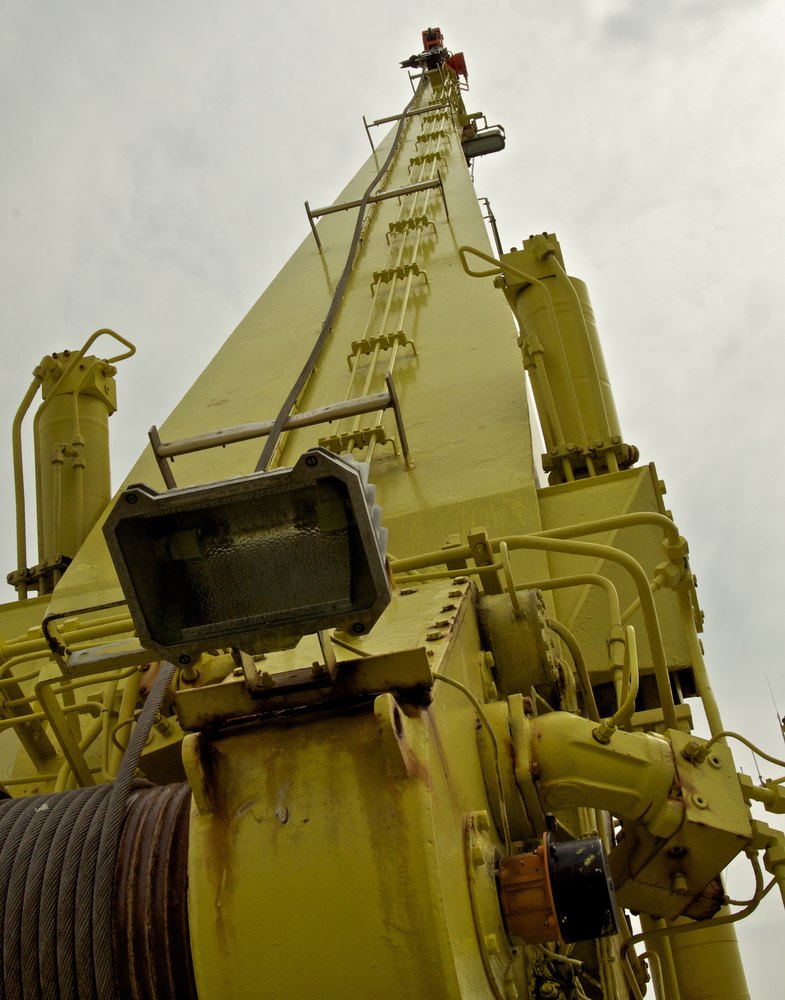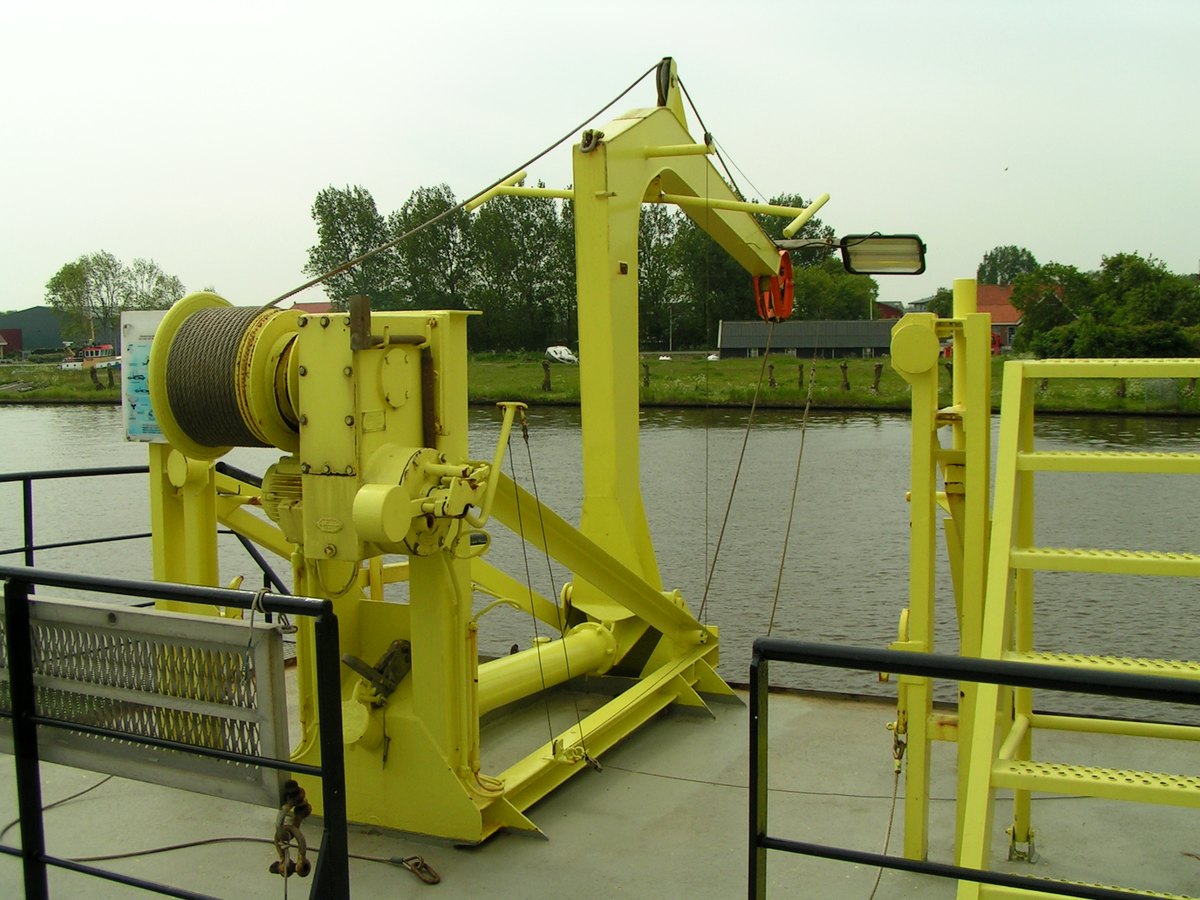 Een kijkje langs de kraanarm waarmee men de boeien en het bijbehorende blok beton dat als anker fungeert aan en van boord zet.