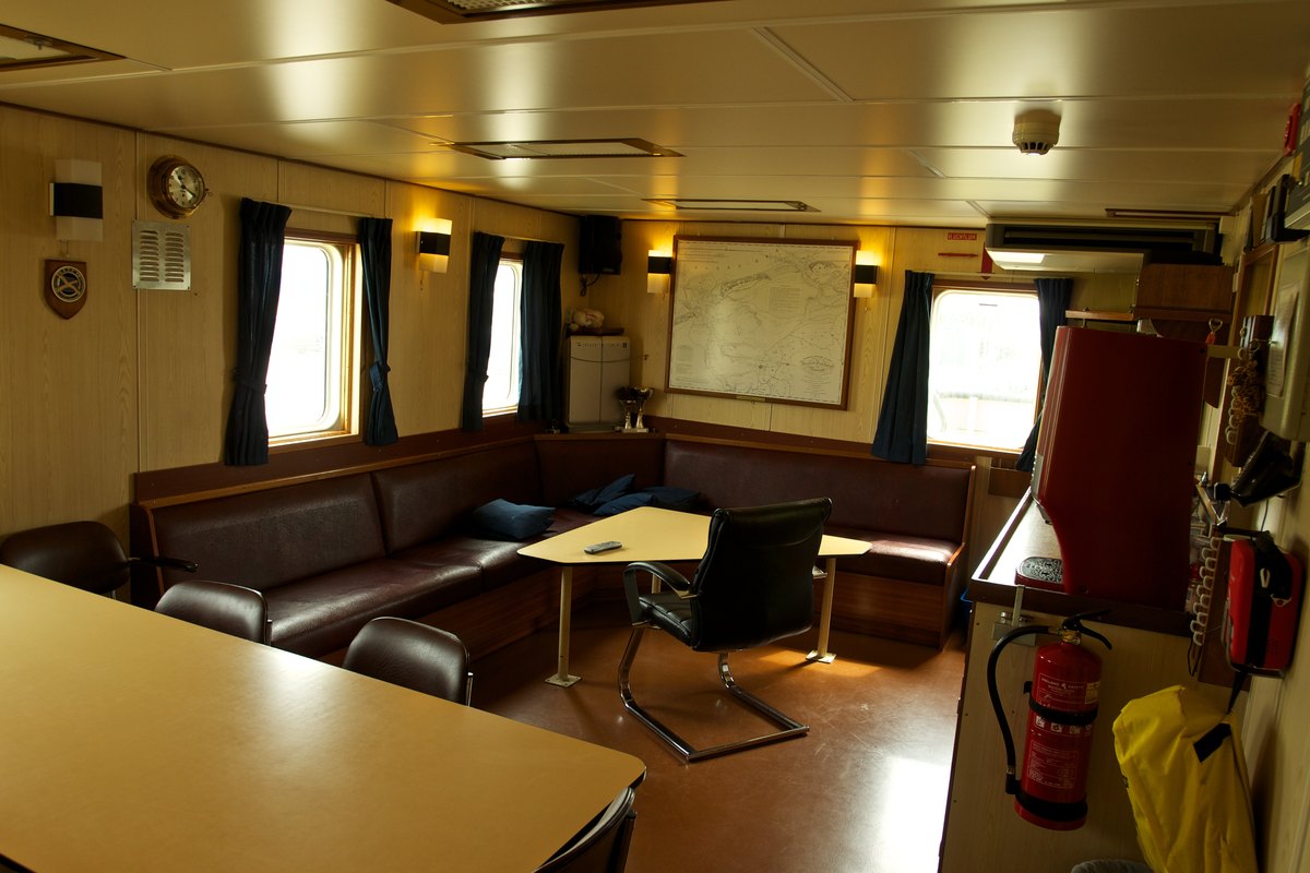 Het bemanningsverblijf. Men zal het daar wel messroom noemen. Links aan de wand een scheepsklok.