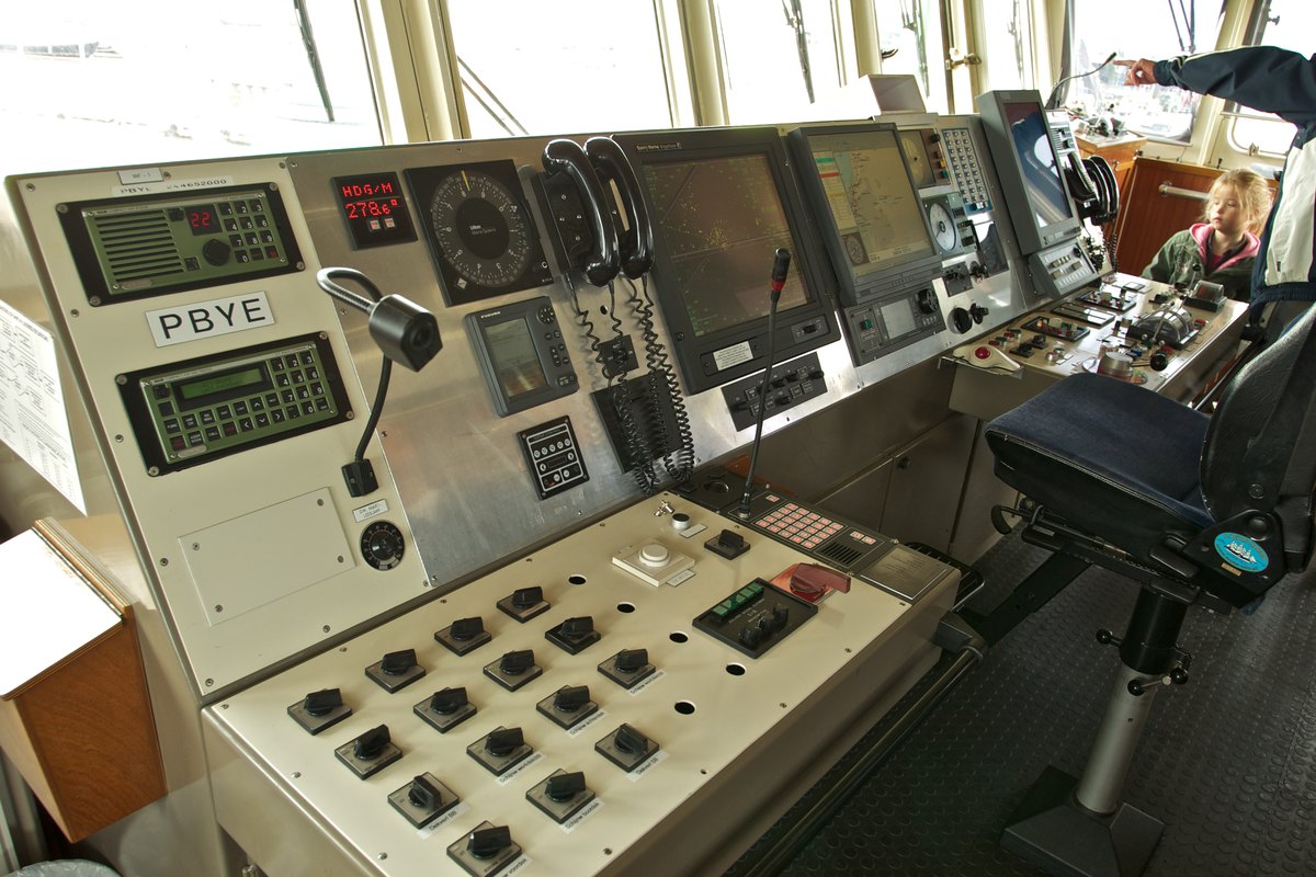 Links van de stuurstand een zitplaats voor een bemanningslid die naar ik denk als een soort van navigator opereert. Op het scherm een moderne electronische waterkaart.