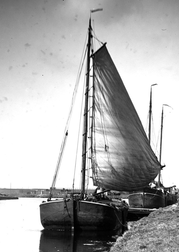 Een boltjalk aan het Haringvliet te Rotterdam. Vergeleken met een Groninger tjalk is de bouw minder robuurst wat vooral aan de stuiten op kop en kont opvalt.