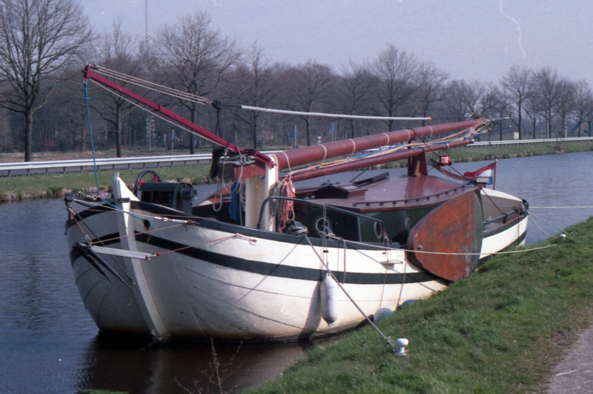 in de Drentse Hoofdvaart. Het scheepje is voorzien van een fraaie jachtenroef, die, zoals het hoort, bij de mast op houdt.