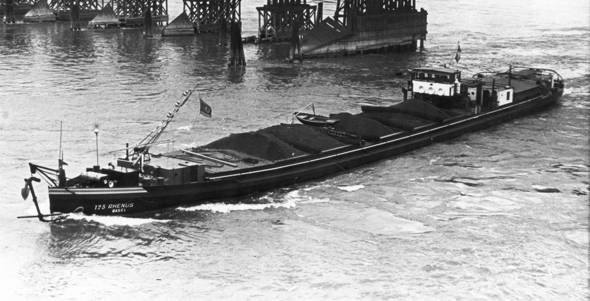 De gerepareerde 'Rhenus 127', als 'Grebbeland' in 1955. Het schip meet dan 79,95 x 9,47 x 2,67 meter en is 1167 ton groot. [