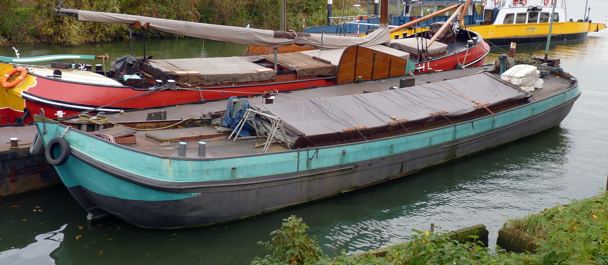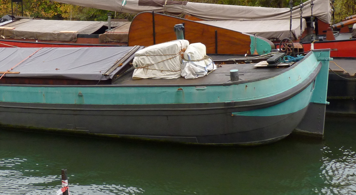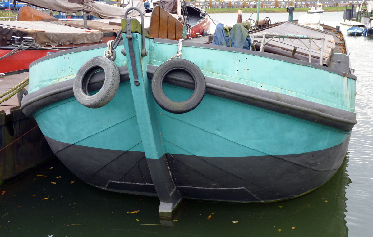 Het is op de foto moeilijk te zien wat nog origineel is en wat er aan het schip hersteld is. De stuiten, zoals hier aan het achterschip maken een strakke zware indruk. De stuiten lopen lang zo sterk niet op als bij de andere Spitse pramen.