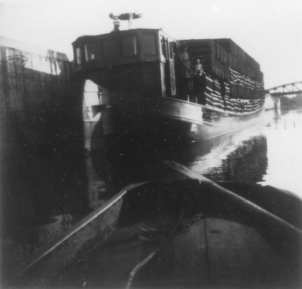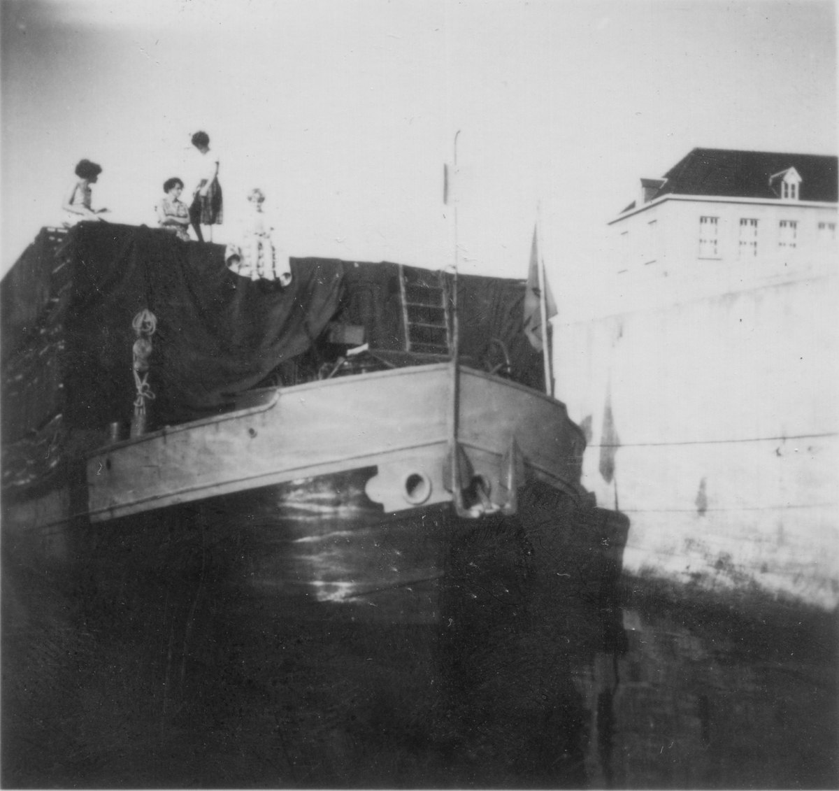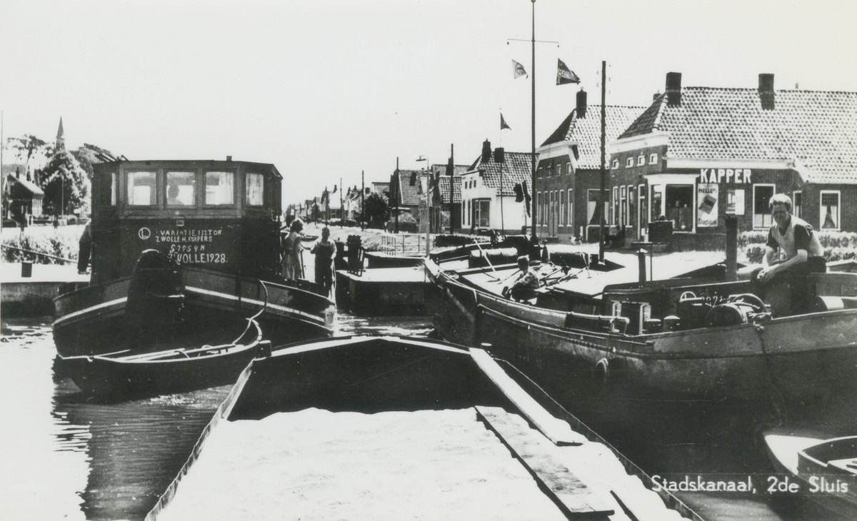 Schipper Slobben uit Avereest liggende aan de Houtmankade ter hoogte van de van Heemskerkstraat te Amsterdam. In het achterliggende pand was een filiaal van