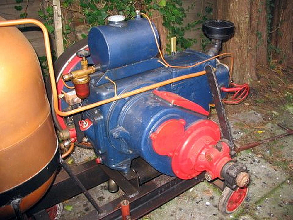 Duidelijk is de aangebouwde vertraging met omkeerbeweging te zien. Het koperen vat dient als koeling. Rechts de aangebouwde 'Baco' keerkoppeling.