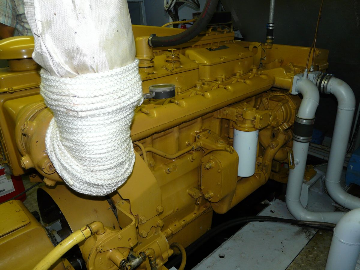 De stuurboordzijde is de uitlaatzijde van deze Caterpillar T3406. De motor maakt gebruik van drukvulling toch moet het uitlaatspruitstuk gekoeld zijn.