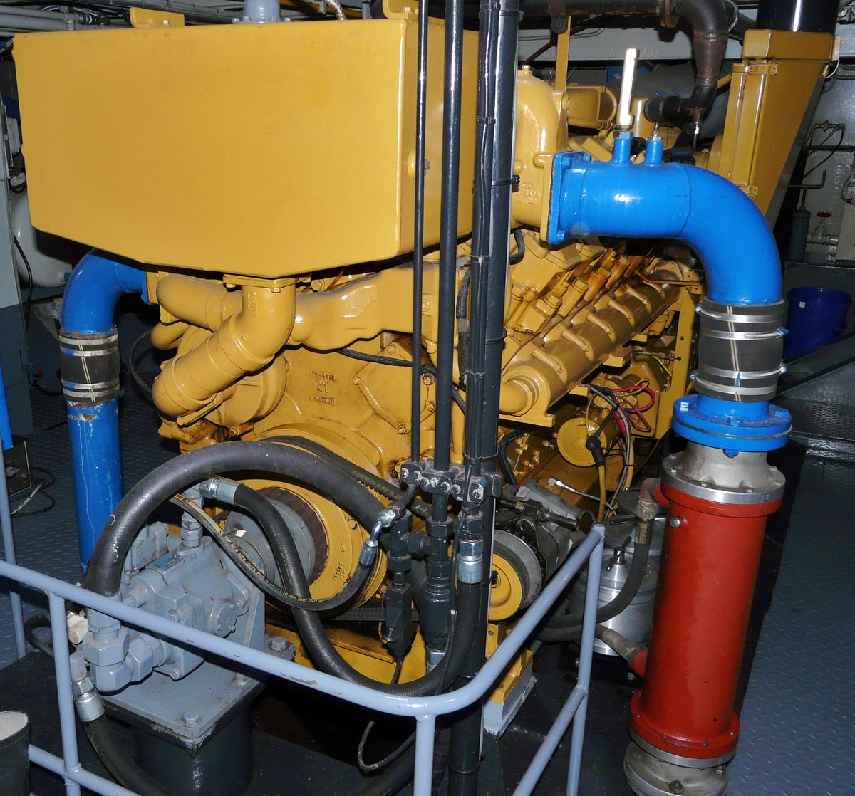 Op de voorgrond een handpomp, een impeller type?, voor zowel het voorpompen, als het 'aftappen' van de smeerolie.