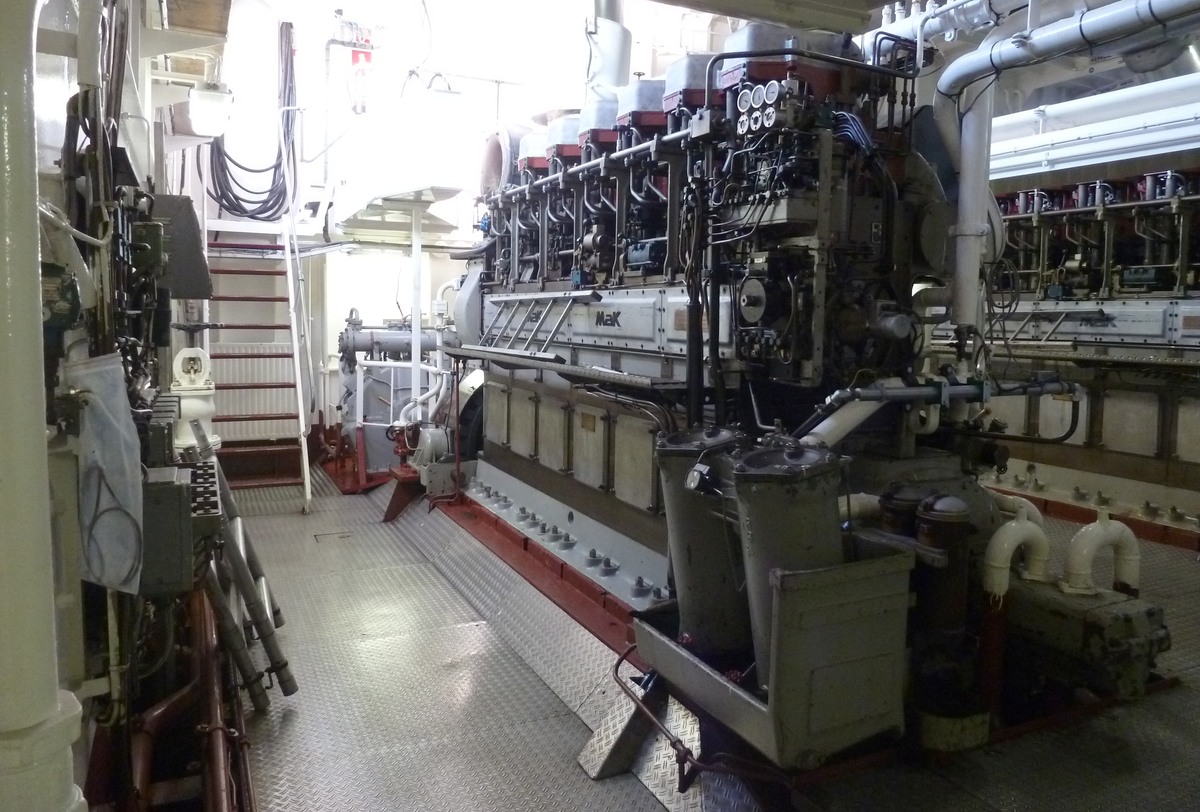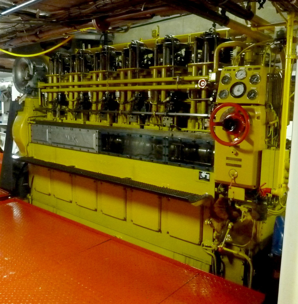 Een van de drie 1850 pk M.A.K.'s 8 M 20 in de duwboot Veerhaven X 'Orka'.