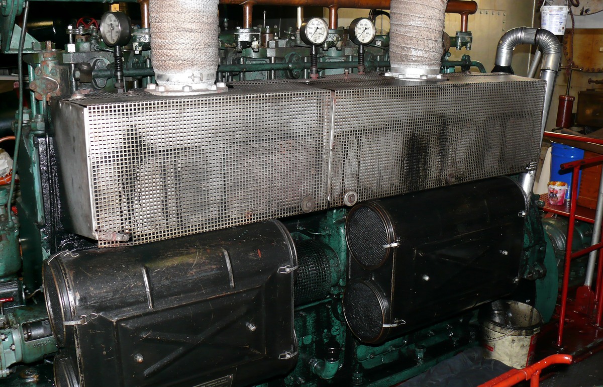 Bovenaan bevinden zich de uitlaatspruitstukken daar onder de luchtfilter met daarachter de spoelluchtpompen.
