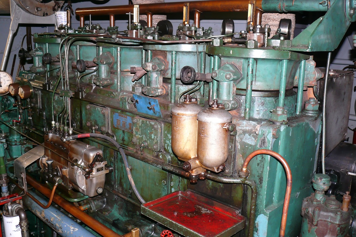 electrisch gestart dus ontbreken zelfs de kleppen voor startlucht. Op de voorgrond een centraalsmeerapparaat en de toerenteller inclusief de electrische tachometer.