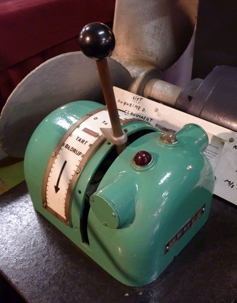 Onder deze hendel (2) was een verticaal kijkglas met een mechanische wijzer die werd aangedreven door een wormwiel op de verticale regulateur as. Deze wijzer kon ongeveer 10 cm in hoogte verschuiven. Met deze regulateur kun je heel nauwkeurig het toerental instellen. Tussen 120 (stationair) en 515 (100 + 10%) toeren. Daarvoor moest je de regulateur 6 of 7 slagen ronddraaien. Je kon dus altijd de motor zo afstellen dat je weinig trillingen had. Opvarend voeren we altijd met de regulateur vol open minus 3/4 slag. Dan draaiden we 480 toeren. Ik draaide deze regulateur met mijn wijsvinger.