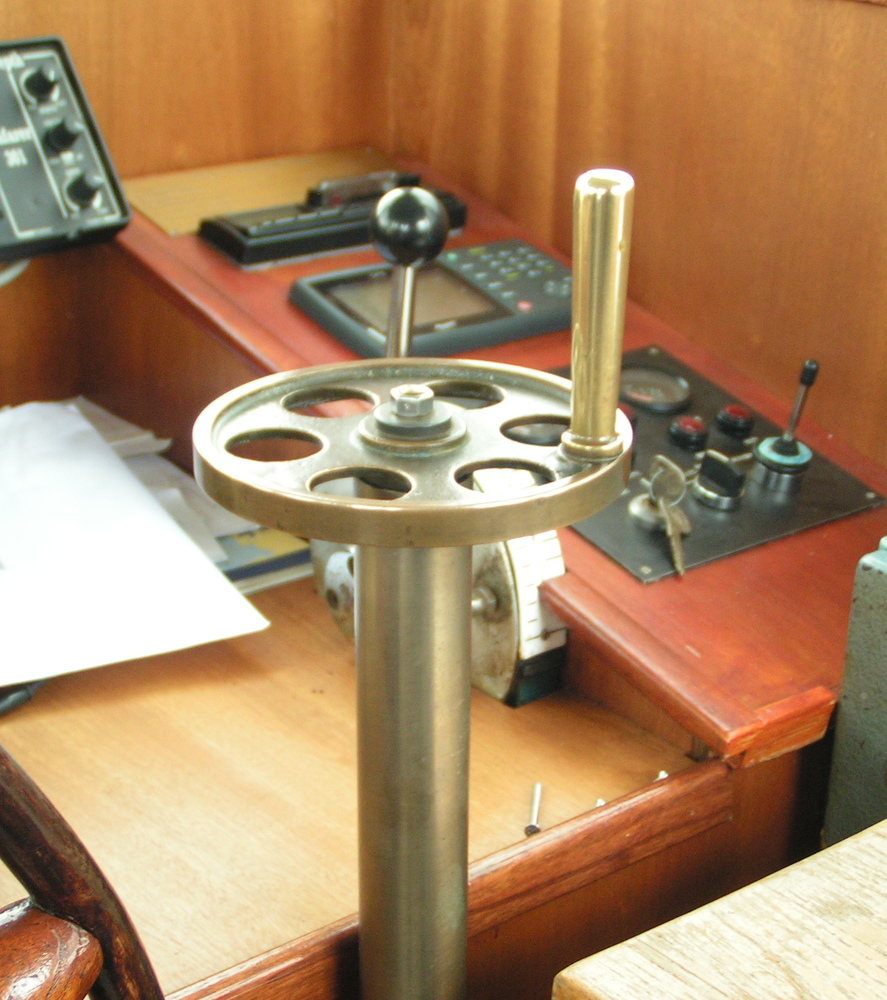 - Deze bediening had nog iets bijzonders: Hij was in hoogte verstelbaar, dat wil zeggen, de drie uitgaande verticale regelstangen naar de machinekamer waren voorzien van spiebanen en een schuif-geleidesysteem. Dan kon er zo'n 2 meter uitgeschoven worden. Veel Duitse kanaalschepen hadden al een in hoogte verstelbaar stuurhuis en door dit systeem kon je een mechanische aansturing van de bediening houden.