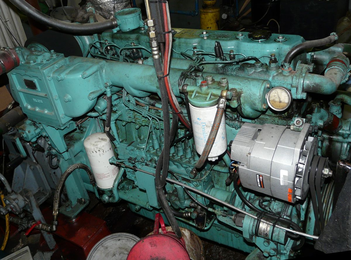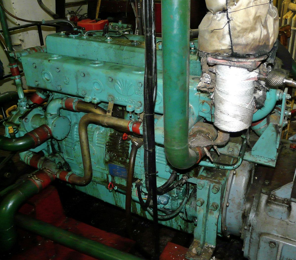 De Daewoo scheepsdiesel aan boord van de steilsteven 'Variatie'.